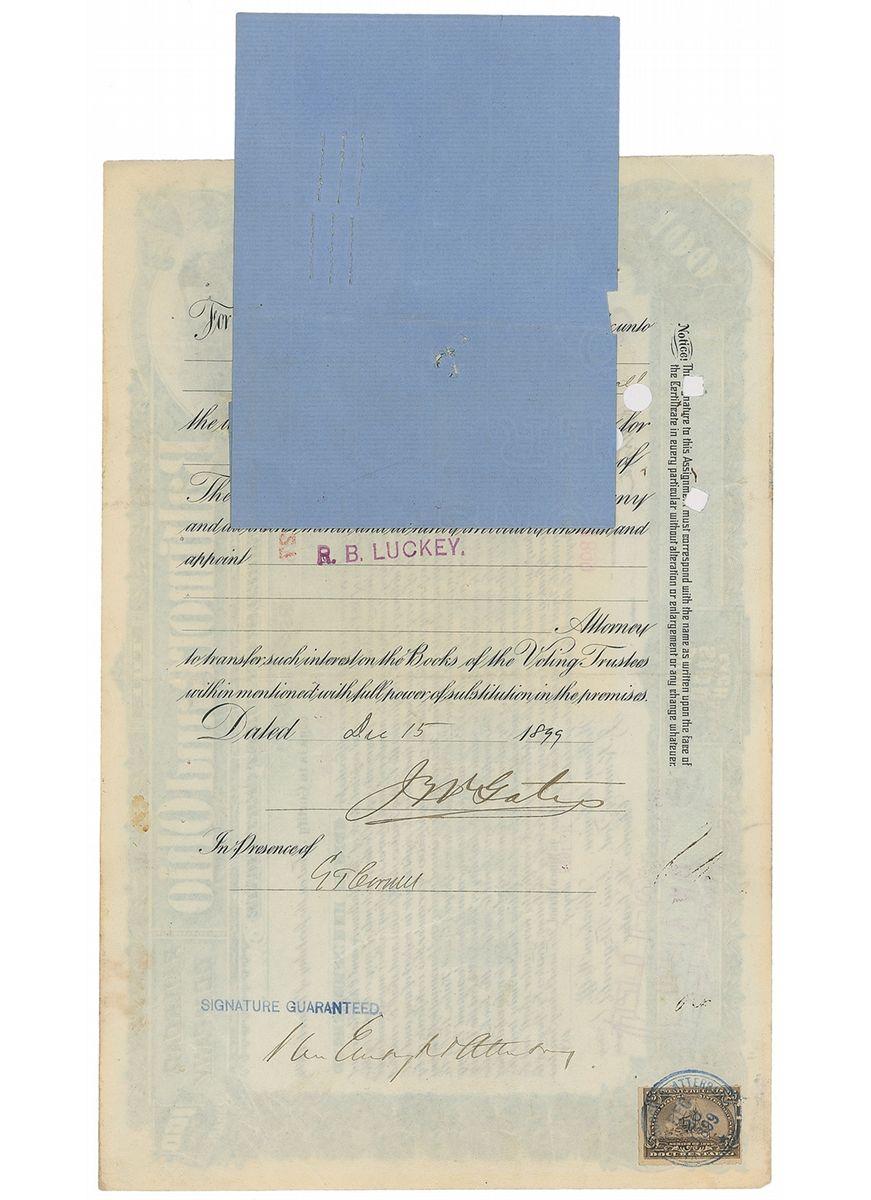 Gilded Age industrialist (1855–1911) who monopolized the wire industry in the United States with the American Steel and Wire Company; nicknamed ‘Bet-A-Million,’ his compulsive gambling became the stuff of legend. DS, signed “J. W. Gates,” one page both sides, 11.25 x 7.25, December 15, 1899. Stock certificate for 100 shares of the Baltimore and Ohio Railroad Company, issued to Gates on June 27, 1889, signed on the reverse to transfer ownership. A sales receipt is affixed above his signature. In fine condition, with expected document wear, a few small stains, and expected cancellation holes (nothing affecting Gates’s crisp, bold signature).