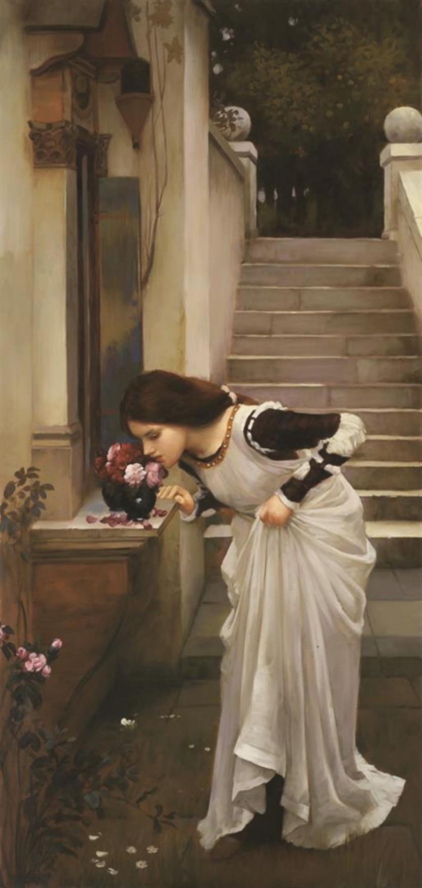 Artist: John Waterhouse  - Title: The Shrine - Medium: Fine Art Giclee on Canvas - Image Size: Approximately 20 inches x 9.5 inches -  Unframed on Unstretched Canvas - John William Waterhouse, byname Nino, (baptized April 6, 1849?, Rome, Italy--died February 10, 1917, London, England), English painter of the Victorian era known for his large-scale paintings of Classical mythological subjects. He is associated both with his predecessors, the Pre-Raphaelite Brotherhood, based on their shared interest in literary subjects (e.g., scenes from Alfred, Lord Tennyson, John Keats, and William Shakespeare), as well as with his contemporaries, the Impressionists, as exemplified by the brushy or sketchy way he sometimes applied paint to canvas.