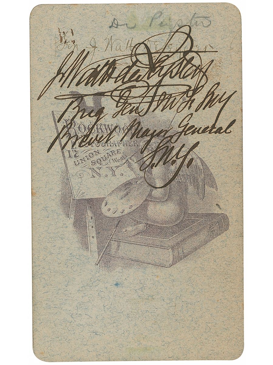 Union officer and writer (1821–1907) noted for his histories of the Revolutionary and Civil Wars. Original 2.25 x 4 carte-de-visite photo by Rockwood of New York, signed in the lower border in black ink, and signed again on the reverse, adding his rank. Light rubbing and surface marks, and several pencil notations to reverse, otherwise fine condition.