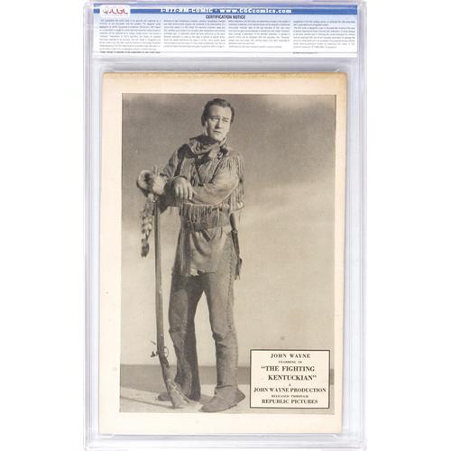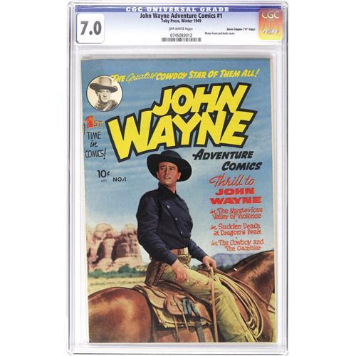 <B>John Wayne Adventure Comics #1 Davis Crippen ("D" Copy) pedigree (Toby Publishing, 1949) CGC FN/VF 7.0 Off-white pages.</B></I> John Wayne was so popular that he probably could have run for president, and this is the first time the Duke appeared on a comic book cover (he was in <B>Tim McCoy</B></I> #16 previously, but only made the back cover... that's Charlton for you!). Overstreet 2006 FN 6.0 value = $489; VF 8.0 value = $1,019. CGC census 6/06: 1 in 7.0, 3 higher. <I>From the Crippen Collection.</B></I> <BR><BR><B>Important notice:</B> Heritage usually auctions material at the rate of 200-250 lots per hour. On some occasions eBay Live bid software or the Internet may not be able to keep up with the pace of the auction. We recommend placing a realistic absentee bid now as insurance to avoid disappointment. Occasionally the auctioneer may eliminate or reject an eBay Live bid, and the auctioneer may also reopen a lot after the close of the eBay live bidding (usually because we missed an audience bid), and may reject your bid even if it shows you as the winning bidder. By bidding via eBay Live, you agree that Heritage may award the lot to another bidder at its sole discretion under the circumstances described above or any other reasonable circumstances. Since eBay bids are not shown to us until we open the lot on the floor, we treat those bids just like floor bids. In most cases the floor responds before the eBay bid is presented to us, due to Internet lag time, so for consistency we have made it a policy that floor bids are always considered first over tie eBay live bids. Also please note that all Heritage lots purchased through eBay Live carry a 22.5% Buyer's Premium. Please make sure you read the Terms and Conditions before you bid. This lot is being auctioned in conjunction with a live floor auction by Heritage Auction Galleries. All final auction and invoice information will be supplied by Heritage Auction Galleries, and all other information should be considered preliminary. Lot:41001 <BR><BR><B>Winning Notification and Billing:</B> After the FINAL session in this auction is complete, Heritage will send e-mail and snail mail invoices. This process normally takes several days. All final auction and invoice information will be supplied by Heritage Auction Galleries, and all other information should be considered preliminary. <BR><BR>This auction will be conducted on a live auction floor and over the Internet through eBay Live. If you choose to place an absentee bid, please take a moment to <font color='#0000ff'><u><a href='http://pages.ebay.com/liveauctions/help/before/laabsentee.html'>learn how eBay Live absentee bidding works</a></u></font><font color='#000000'>
