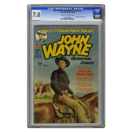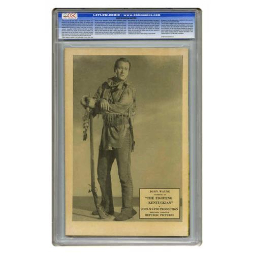 <B>John Wayne Adventure Comics #1 (Toby Publishing, 1949) CGC FN/VF 7.0 Cream to off-white pages.</B></I> The Duke parlayed his tremendous popularity into a namesake comic book that ran for more than five years and attracted such notable artists as Frank Frazetta, Al Williamson, and Harvey Kurtzman. The premiere issue has photo covers front and back, the latter touting Wayne's latest Republic Pictures vehicle, "The Fighting Kentuckian." Overstreet 2005 FN 6.0 value = $486; VF 8.0 value = $1,013. CGC census 12/05: 1 in 7.0, 3 higher.