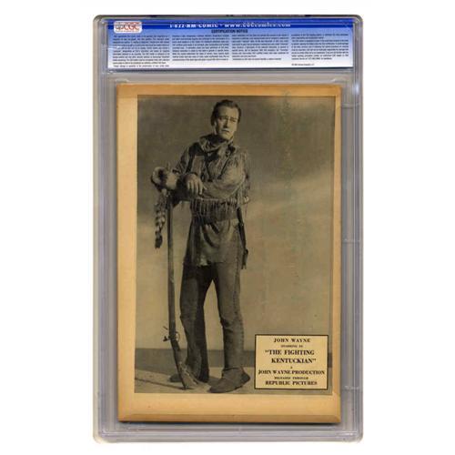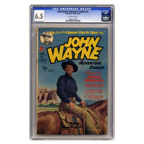 <B>John Wayne Adventure Comics #1 (Toby Publishing, 1949) CGC FN+ 6.5 Off-white pages.</B></I> The first time John Wayne appeared on a comic book cover was right here (he had been in <B>Tim McCoy</B></I> #16 previously, but was relegated to <I>back</B></I>-cover honors there). Not liking John Wayne is borderline un-American, and heck, even Western fans in other nations will want to go after this first issue for the cowboy icon! Overstreet 2005 FN 6.0 value = $486; VF 8.0 value = $1,013. CGC census 12/05: 1 in 6.5, 4 higher.