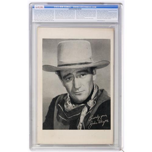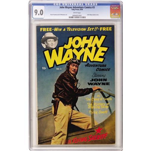<B>John Wayne Adventure Comics #3 (Toby Publishing, 1950) CGC VF/NM 9.0 White pages.</B></I> The superstar of the silver screen deserved nothing less than the superstars of comic art in his self-titled series and Frank Frazetta and Al Williamson were certainly at the top of their game here. This is early Williamson art, too, predating his work for EC. A WWII photo of the Duke graces this issue's cover. Overstreet 2006 VF/NM 9.0 value = $702; NM- 9.2 value = $960. CGC census 3/07: 1 in 9.0, 1 higher.<BR><BR><b>Shipping:</b> Comics - Slabbed (certified) (<a target=""_blank"" href=""http://www.heritageauctions.com/common/shipping.php"">view shipping information</a>)