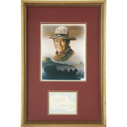 <B>John Wayne Autograph Display with Photo.</B></I> A great John Wayne autograph cut reading "To Karen, John Wayne" in black ballpoint. Matted and framed, alongside a 7.5" x 9.5" image of the Duke, to an overall size of 14.5" x 22." In Excellent condition. <I>Accompanied by a COA from PSA/DNA.</B></I><BR><BR><b>Shipping:</b> Framed - with Glass, Medium (<a target="_blank" href="http://www.heritageauctions.com/common/shipping.php">view shipping information</a>)
