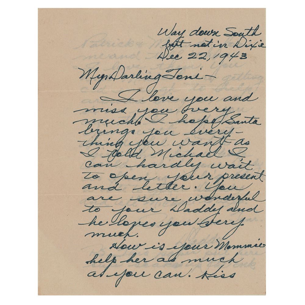 World War II-dated ALS signed “Daddy,” two pages, 7 x 8.75, December 22, 1943. A handwritten letter from John Wayne to his daughter Toni, addressed from “Way down South but not in Dixie,” in full (spelling retained): “I love you and miss you very much. I hope Santa brings you everything you want as I told Michael I can hardly wait to open your present and letter. You are sure wonderful to your Daddy and he loves you very much. How is your Mommie, help her as much as you can. Kiss Patrick & Melinda for me and tell them I love them. You and Michael are getting old enough to help around home, so do as much as you can to be useful. You are the most wonderful little girl in this whole world—which your Daddy is finding is big. Please write to your Daddy and tell Michael to also. I love you Toni.” Wayne adds a postscript: “This paper out here sure soaks up the ink.” In fine condition.