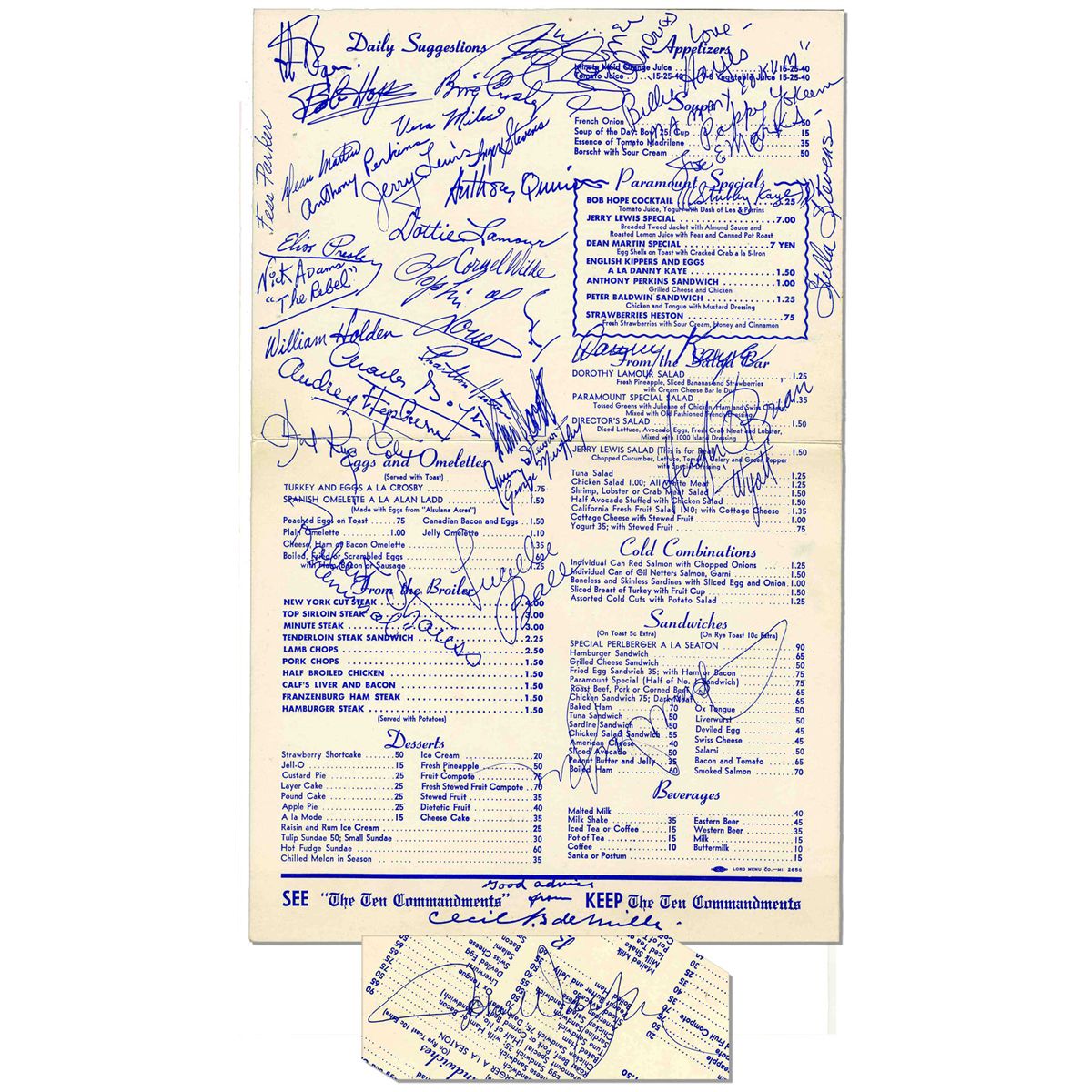 Unique John Wayne autograph on a Paramount Pictures lot ''Cafe Continental'' restaurant menu. Boldly signed ''John Wayne'' upside down and across the sandwiches section in blue ink. With printed signatures of other Hollywood luminaries all over the menu. Royal blue menu measures 7.25'' x 11.5'' unfolded and 7.25'' x 6'' folded. Covers of menu have pinholes and minor foxing in spots, else near fine condition.