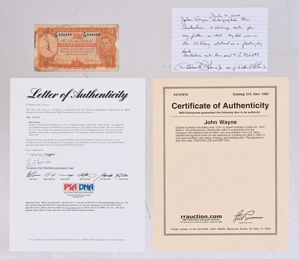 Obtained by U.S. Sailor stationed on floating dry dock 1944. Comes with COA of signature and letter attesting of provenance.