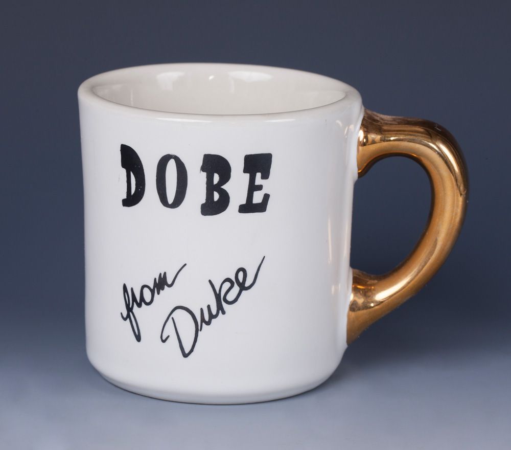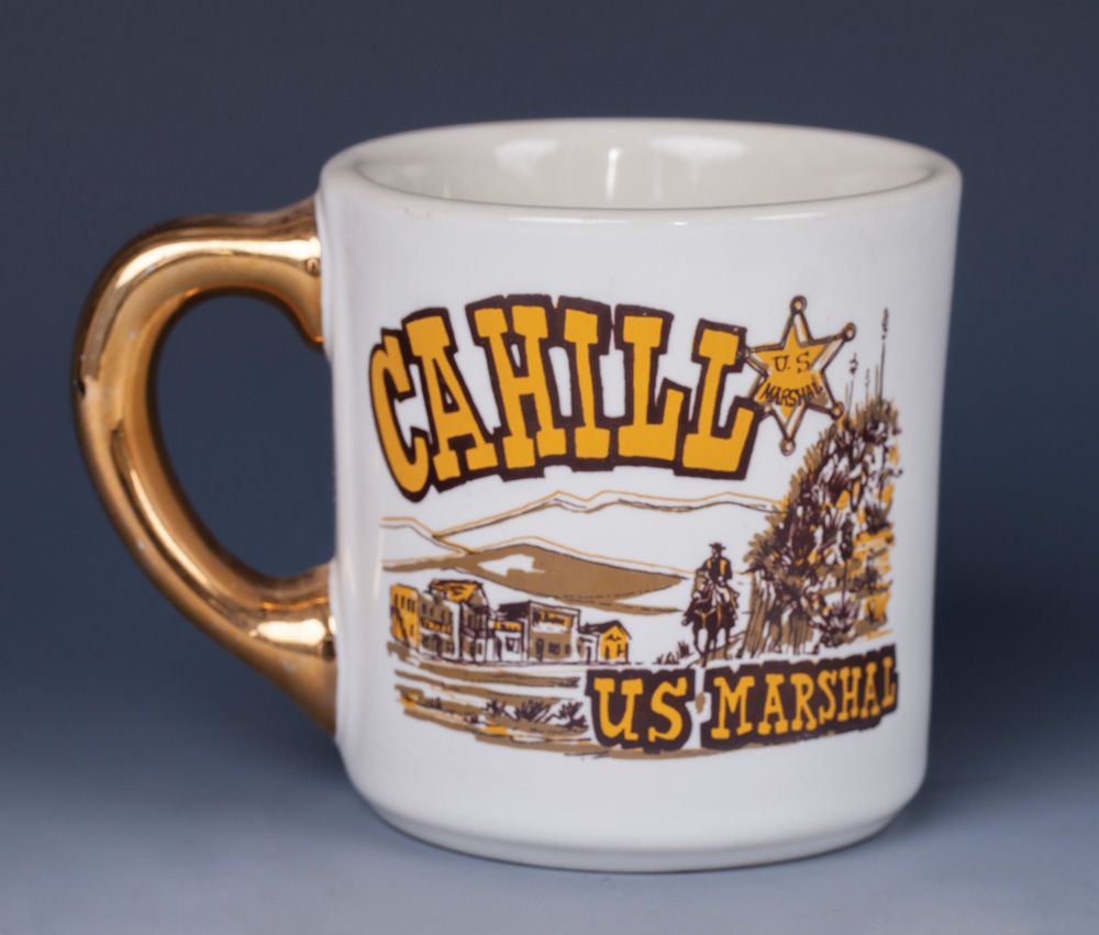 John Wayne "Cahill US Marshall" Coffee Mug Presented to Harry Carey, Jr. Harry Carey, Jr.'s John Wayne Personalized Coffee Mug for the 1973 film, "Cahill US Marshall." To "DOBE from Duke." Made by Ketchum Originals, Long Beach, Cal. Excellent condition. Harry Carey, Jr. appeared as the character of Hank in the movie, the last of 10 films that he made with John Wayne. PROVENANCE: Carey Family Trust.