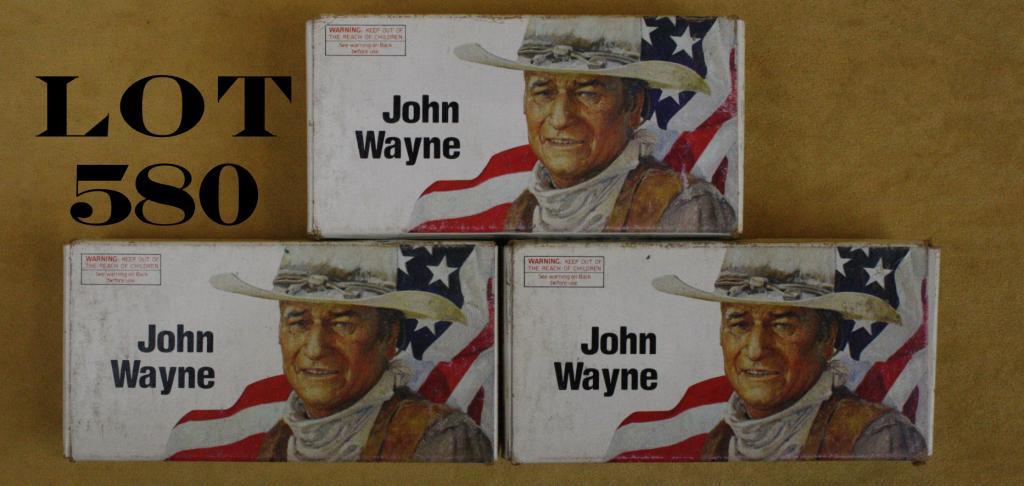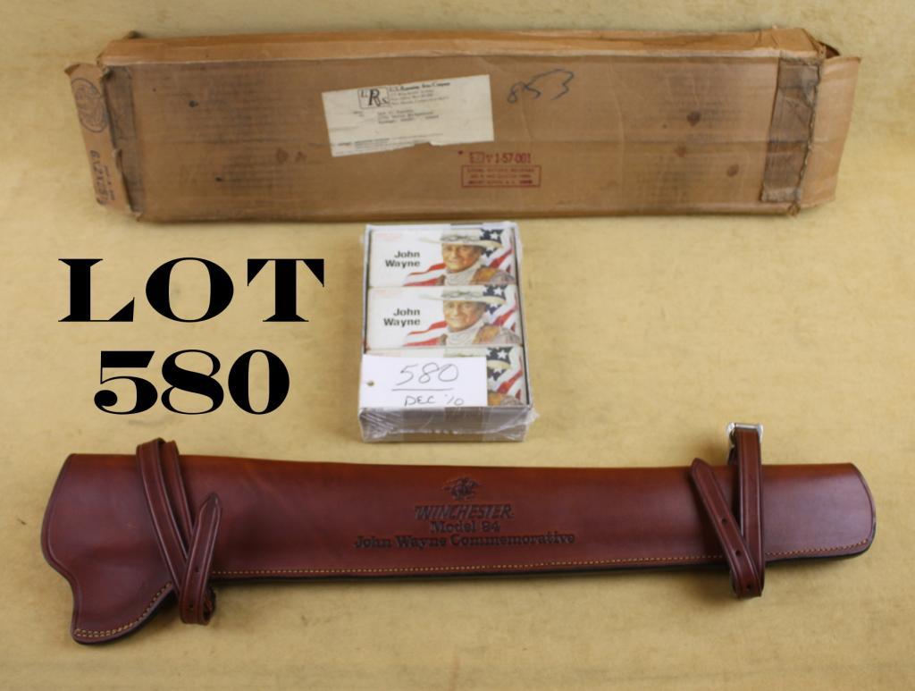 John Wayne Commemorative leather carbine scabbard in cardboard shipping box and three boxes of John Wayne Commemorative 32-40 ammunition. These accessories were sold at the time of the popular John WayneCommemorative large loop lever action Winchester Model ’94 SRC. Est.: $100-$200.