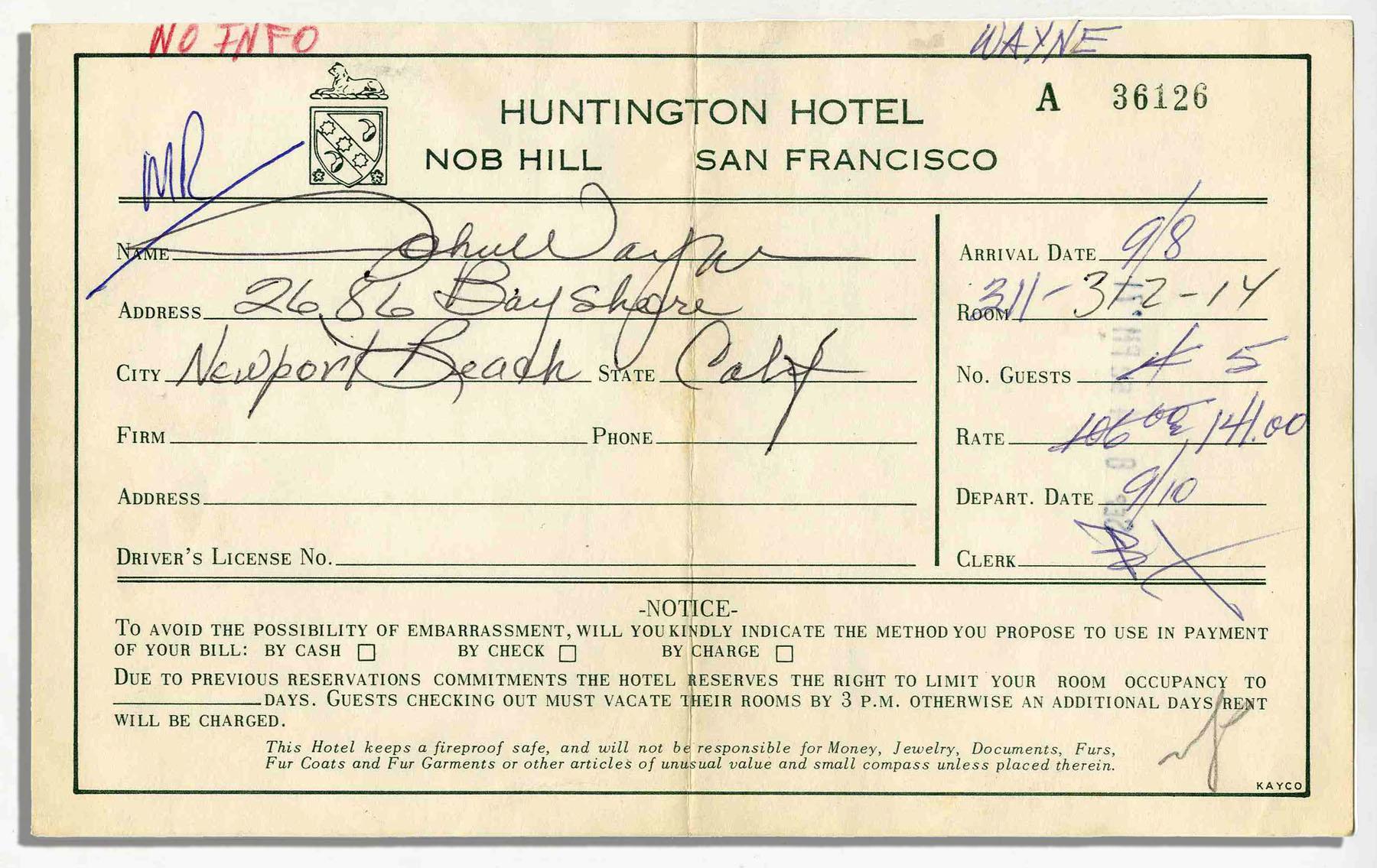 John Wayne 1971 hotel registration card signed from the Huntington Hotel in San Francisco, California at a rate of $144 a night. Card includes Wayne's home address (2686 Bayshore, Newport Beach, CA) and other information regarding his stay at the hotel. Card, measuring 8'' x 5'', has a vertical center fold. Near fine condition.