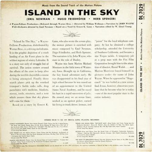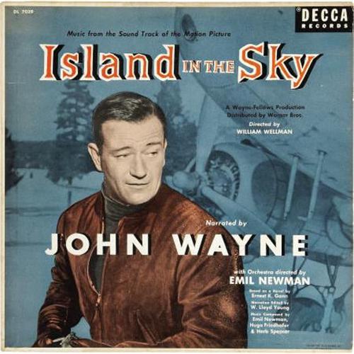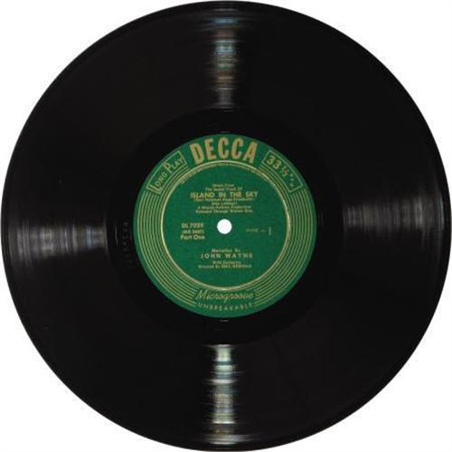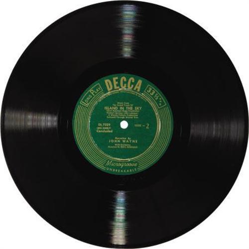 <B>John Wayne</B></I> <B><I>Island in the Sky</B></I></B></I> <B>10" LP (Decca 7029, 1953).</B></I> The Duke narrates music from the soundtrack of a movie he co-produced. It's based on a true WWII-era story. The cast included Wayne, Lloyd Nolan, James Arness, Andy Devine, and an uncredited Fess Parker. The record's a rare one, and the disc included here is pristine! Condition: EX 7 (cover, with tape along top and bottom of back)/ NM 8 (record).<BR><BR><b>Shipping:</b> Recordings (<a target="_blank" href="http://www.heritageauctions.com/common/shipping.php">view shipping information</a>)