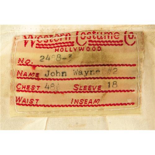 <B>John Wayne Labeled White Shirt.</B></I> Did you know John Wayne had a size 48 chest and a size 18 sleeve? This white, long-sleeved shirt, worn by the Duke in an undetermined film, provides these statistics in its "Western Costume Co., Hollywood" label, sewn into the inside collar of this costume piece. "John Wayne # 2" appears on the label as well, along with the number 2488-3. There's some staining on the inside collar, but since it likely came from John Wayne, what's wrong with that? Very Fine + condition.<BR><BR><b>Shipping:</b> Clothing, Costumes & Jerseys (<a target="_blank" href="http://www.heritageauctions.com/common/shipping.php">view shipping information</a>) <BR><BR><B>Important notice:</