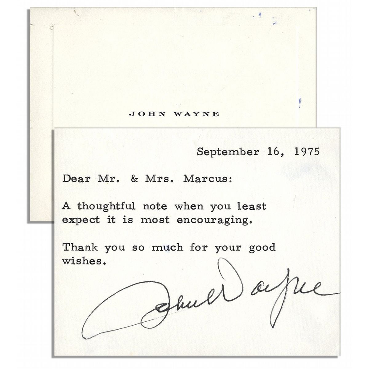John Wayne typed note signed, dated 16 September 1975. Note is printed on his personal stationery with ''John Wayne'' printed on the front of card. Note reads in full: ''September 16, 1975 / Dear Mr. & Mrs. Marcus: A thoughtful note when you least expect it is most encouraging. Thank you so much for your good wishes.'' Signed ''John Wayne'' boldly in black ink. Includes original envelope postmarked from Beverly Hills. Very good.