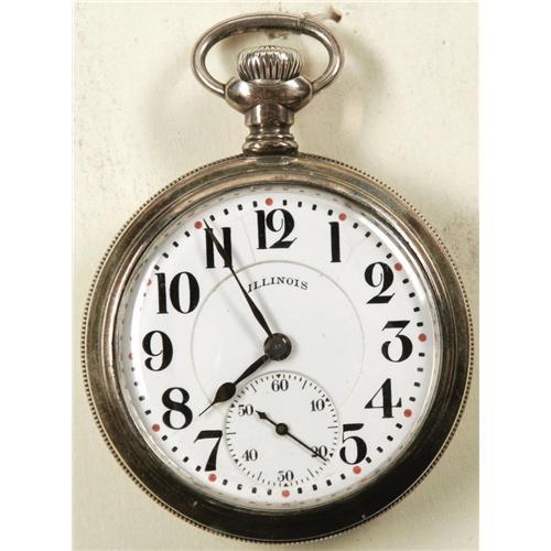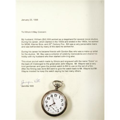 <B>John Wayne Owned Pocket Watch.</B></I> A striking sterling silver Illinois pocket watch, circa 1918, with "Duke" engraved on the back. The watch was owned and used by Wayne for many years before he gave it as a gift to former Warner Bros. stagehand Bill Wilt. The watch is in Very Fine condition with a little tarnishing, and has been mounted in a 16" x 12" display box along with a b&w photo of Wayne and letter of authenticity from Wilt's wife.<I>From the Robert Johnson Memorabilia Collection.</B></I><BR><BR><b>Shipping:</b> Miscellaneous Collectibles, Smal (<a target="_blank" href="http://www.heritageauctions.com/common/shipping.php">view shipping information</a>) <BR><BR><B>Important notice:<