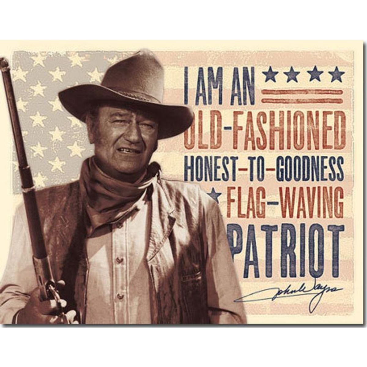 "I Am An Old Fashioned Honest-To Goodness Flag-Waving Patriot" - John Wayne metal pub bar sign, with pre-drilled holes for mounting. 12 1/2" X 16 1/2".Â