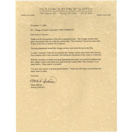 <B>John Wayne Prop Lariat from "The Cowboys."</B></I> A vintage lariat used by Wayne in the 1972 Western, in Excellent condition. <I>Accompanied by LOA from Hollywood Prop Supply.</B></I><I>Accompanied by LOA from Hollywood Prop Supply.</B></I><BR><BR><b>Shipping:</b> Miscellaneous Collectibles, Smal (<a target="_blank" href="http://www.heritageauctions.com/common/shipping.php">view shipping information</a>)