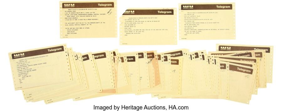 John Wayne Received Large Group of Western Union Telegrams (1976-1979). A large collection of Western Union telegrams from the 1970s (ranging in date from 1976 to 1979) mostly sent to Wayne. These were sent to various hospitals (though some are congratulatory for his Congressional Gold Medal or birthday wishes) from his many famous friends who wished him well including (in alphabetical order): Spiro Agnew, Steve Allen, Gene Autry, Ernest Borgnine, George Burns, James Cagney, Rory Calhoun, Gloria De Haven, Glenn Ford, Barry Goldwater, Billy Graham, William Holden, Bob Hope, Patricia Neal, George Peppard, Martha Raye, Frank Sinatra, Red Skelton, Steven Spielberg, Rod Steiger, James Stewart, Elizabeth Taylor, Hal Wallis, Raoul Walsh, Barbara Walters, and Natalie Wood, among a few others; some in particular are very funny like the ones from Burns and Peppard; a wonderful record of correspondence amongst friends that sadly does not exist in today's digital era.