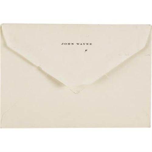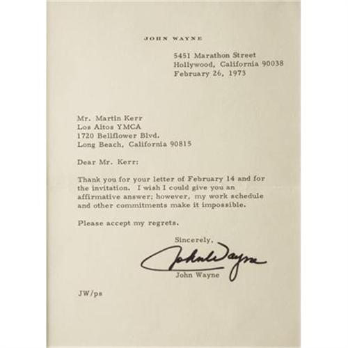 <B>John Wayne Signed Letter, Framed with Photo.</B></I> A 5.5" x 7.5" letter signed by John Wayne (on Wayne's letterhead), dated February 29, 1973. Addressed to one Martin Kerr of the Los Altos YMCA, the letter relays Wayne's regrets for being unable to attend an unspecified event. The year 1973 was a busy one for Wayne, he was just finishing up <I>Cahill U.S. Marshal,</B></I> would begin filming <I>McQ,</B></I> and shot a handful of television appearances -- including <I>Rowan & Martin's Laugh-In.</B></I> Ever the gentleman, the letter expresses his sincere apologies and is signed by Wayne in black ink. Matted and framed to an overall size of 20" x 14.5" and accompanied by a 7.5" x 9.5" color photo of Wayne on horseback. In Excellent condition. <I>Accompanied by a COA from PSA/DNA.</B></I><BR><BR><b>Shipping:</b> Framed - with Glass, Medium (<a target="_blank" href="http://www.heritageauctions.com/common/shipping.php">view shipping information</a>)