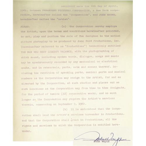 <B>John Wayne Signed "The Man Who Shot Liberty Valance" Contract.</B></I> A 56-page employment agreement between Paramount Pictures and John Wayne, engaging his services for John Ford's classic Western <I>The Man Who Shot Liberty Valance.</B></I> Boldly signed in blue ink by Wayne on the last page and accompanied by six unsigned, related documents, all in Very Fine condition with the usual staple and binder holes, and light staining to the left edges of a few pages and to the binder. <I>Accompanied by a certificate of authenticity.</B></I><I>Accompanied by LOA from PSA/DNA.</B></I><BR><BR><b>Shipping:</b> Small Flat (<a target="_blank" href="http://www.heritageauctions.com/common/shipping.php">view shipping information</a>)