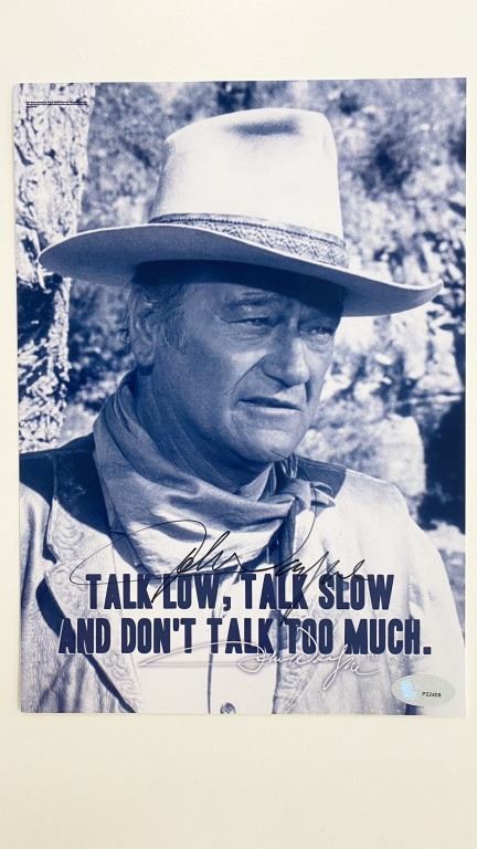 John Wayne signed movie photo, measures 8x10 inches. Marion Robert Morrison, known professionally as John Wayne and nicknamed The Duke, was an American actor and filmmaker who became a popular icon through his starring roles in Western films.