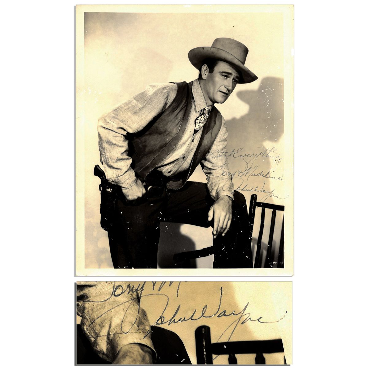 Handsome John Wayne 8'' x 10'' sepia matte photo. Inscribed and signed in black ink: ''Best of Everything / Tony + Madeline / John Wayne''. Photo has a very slight crease to top right corner and numerous white specks throughout where the finish has come off. Very good condition.