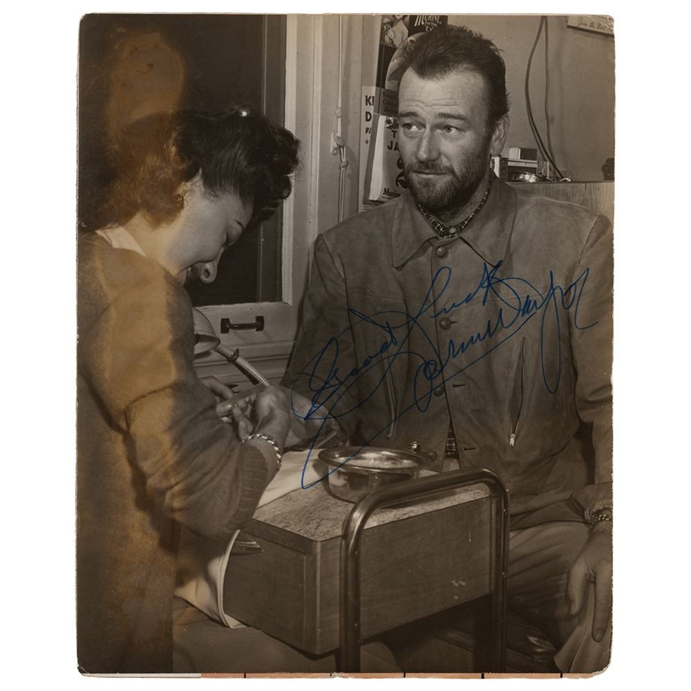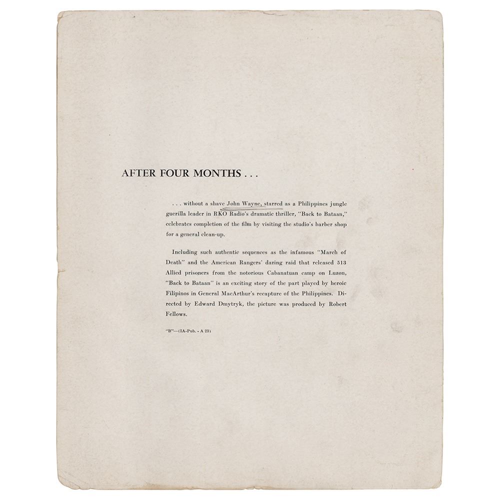 Uncommon glossy 8.5 x 10.5 photo of John Wayne sporting a beard and having his nails filed, signed in felt tip, "Good luck, John Wayne." Reverse of left side is affixed to a RKO Radio Studio 'Candid Shots' folder, which lists information for the 1945 WW2 film Back to Bataan. In very good to fine condition, with scattered light creasing and surface impressions, and a vertical area of discoloration along the left side.