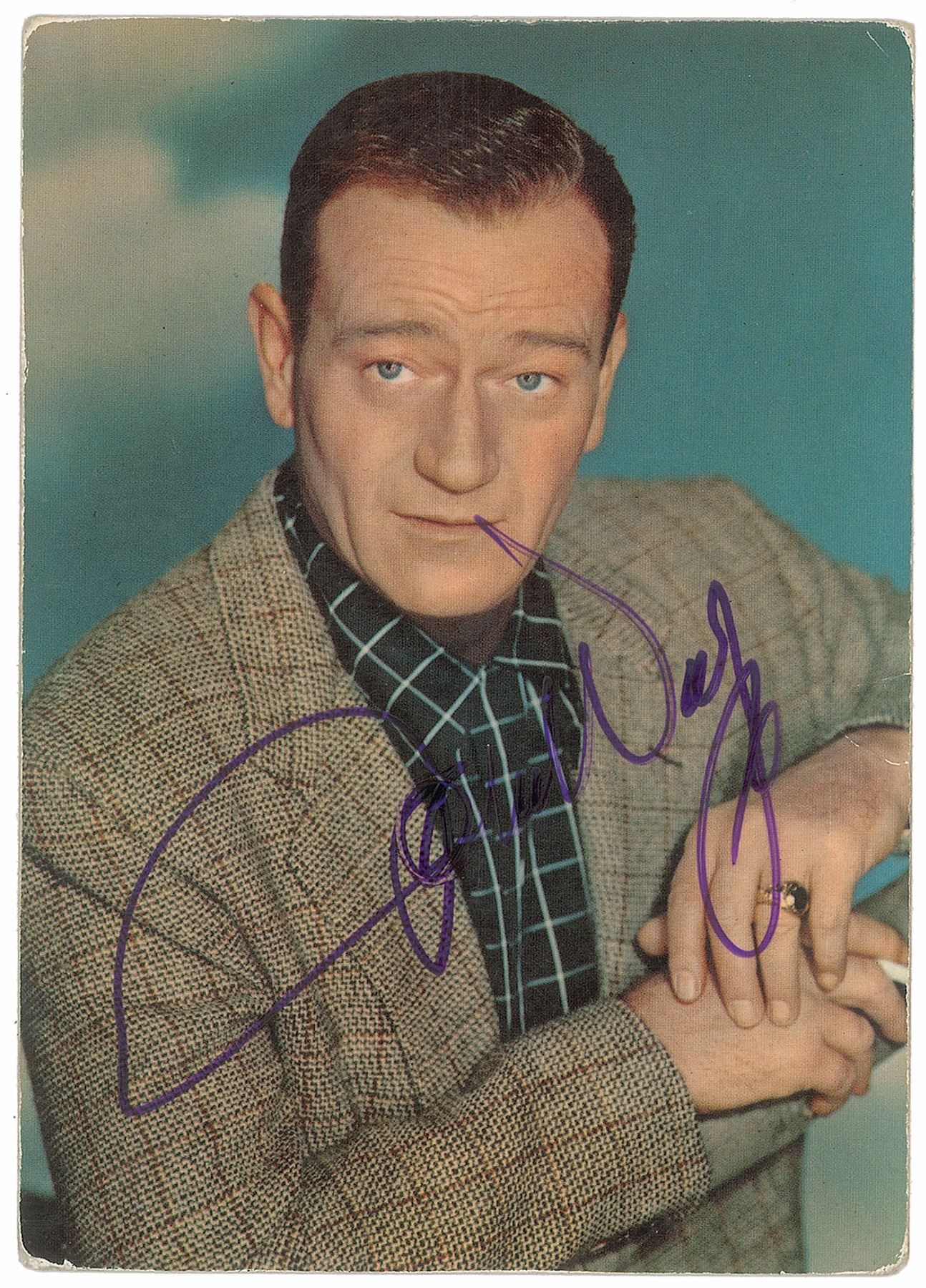 Appealing color glossy 4 x 5.75 postcard photo of Wayne in a casual half-length pose, signed in purple felt tip. In fine condition, with scattered creasing and corner dings.