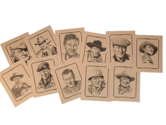 11 8”x10” hand drawn sketch copies on stationary paper of John Wayne as different film characters. Drawn by M. Chin 1978. Double sided.