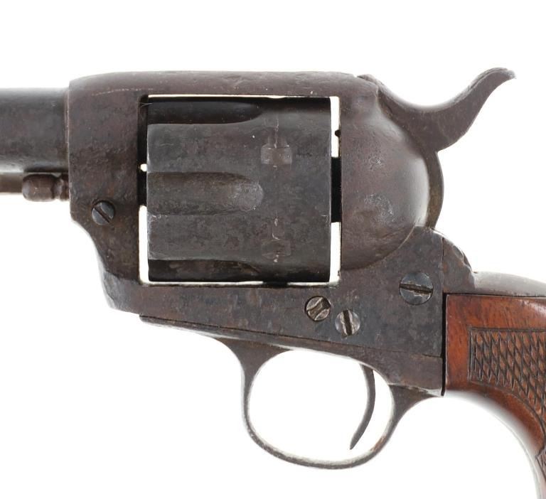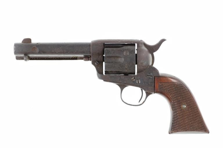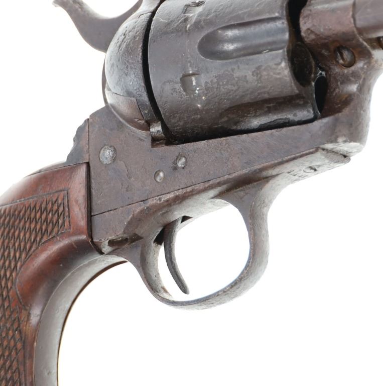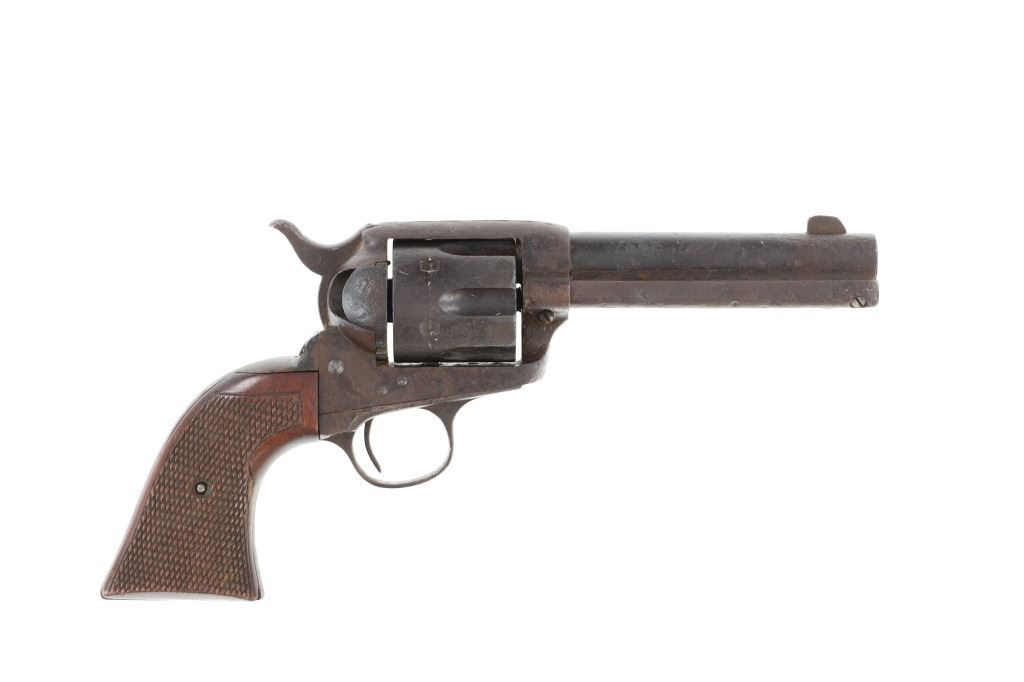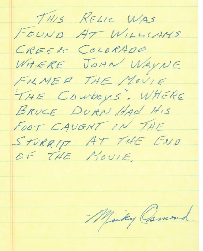 This is an original Colt Single Action Army Model 1873 revolver serial number 283097 manufactured in 1906 attributed as being used by John Wayne for the filming of "The Cowboys" in 1972. The revolver comes with a signed letter from Micky Osmond stating, "This Relic was found at Williams Creek Colorado where John Wayne filmed the movie "The Cowboys". Where Bruce Durn ha his foot caught in the stirrup at the end of the movie." The piece is a single action army Colt revolver chambered in 45 COLT with a two line Colt address atop the 4.75" round barrel. The frame, trigger guard and butt all have the matching "283097" serial number signifying a manufacture of 1906. The gun is in relic, dug condition, but surprisingly still appears to function. The signed letter is included. A unique piece with provenance. Curio and Relic or Modern firearm requires an FFL or Curio transfer.