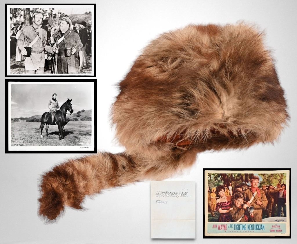 Coon skin hat worn by John Wayne in the film 'The Fighting Kentuckian", signed inside by John Wayne. Provenance includes a letter dated June 2, 1956, from Elizabeth Quinley, who worked in the prop department at Republic Studios. The hat is stamped with the Republic Studio stamp along with John Wayne's name. Included are two glossy promotional 8 x 10 from the film, along with a 11" x 14" colorized movie poster.
