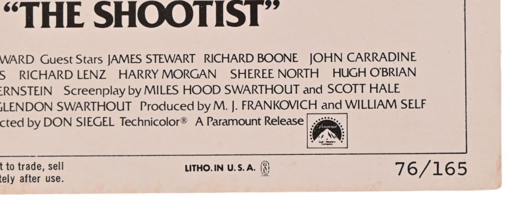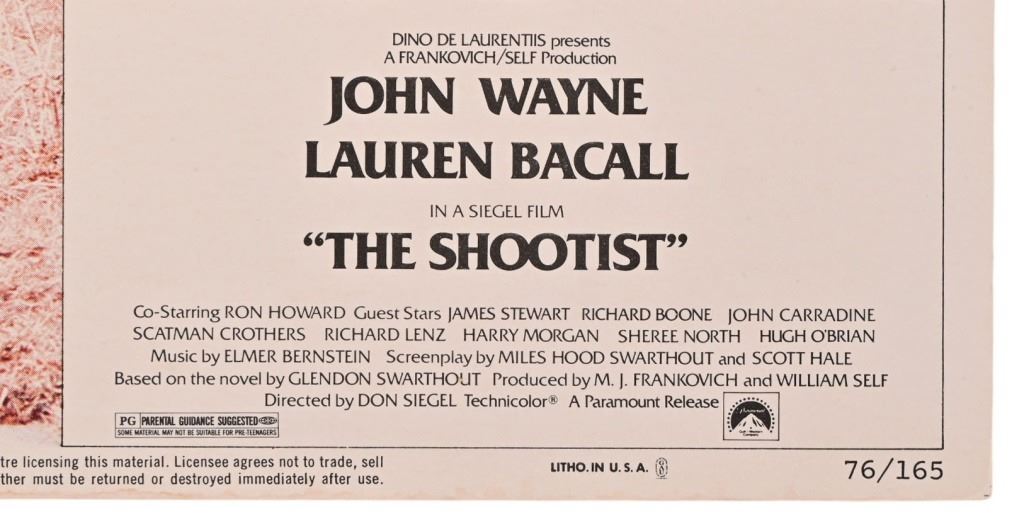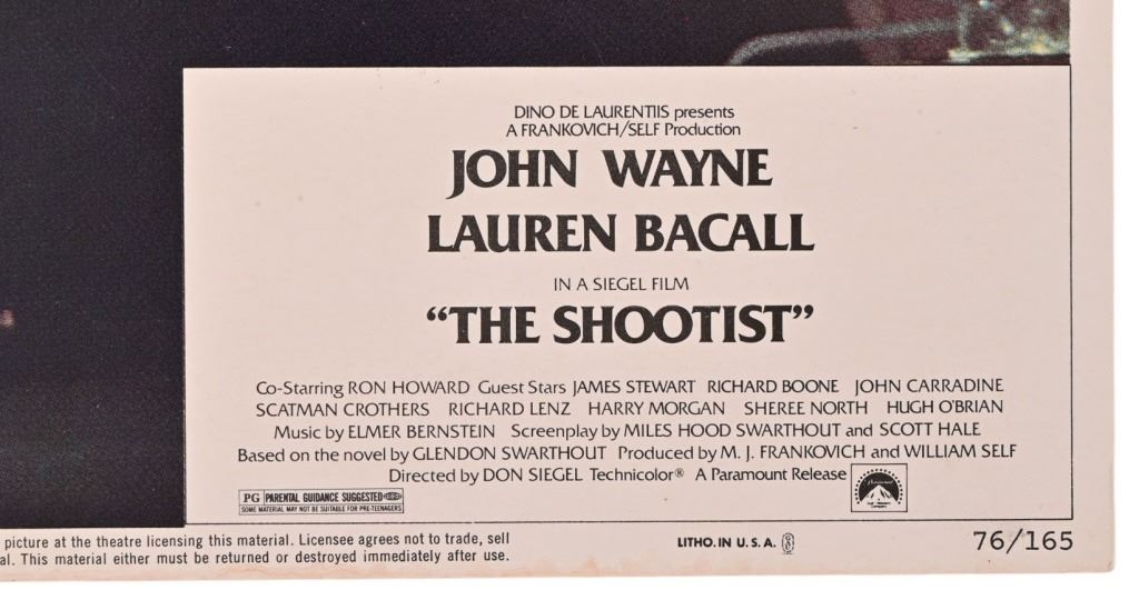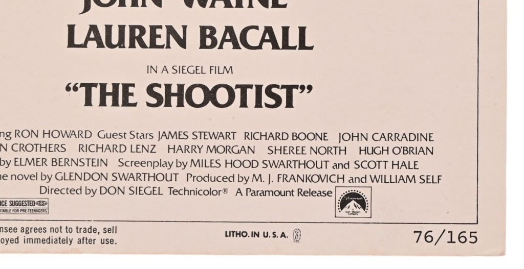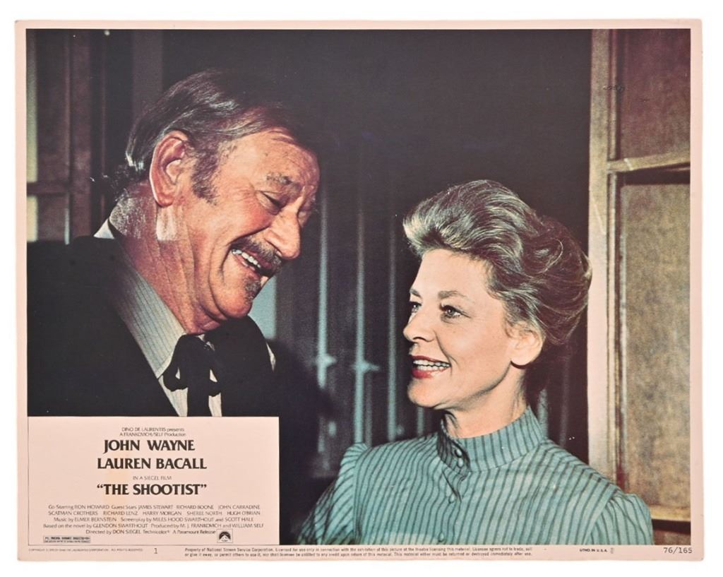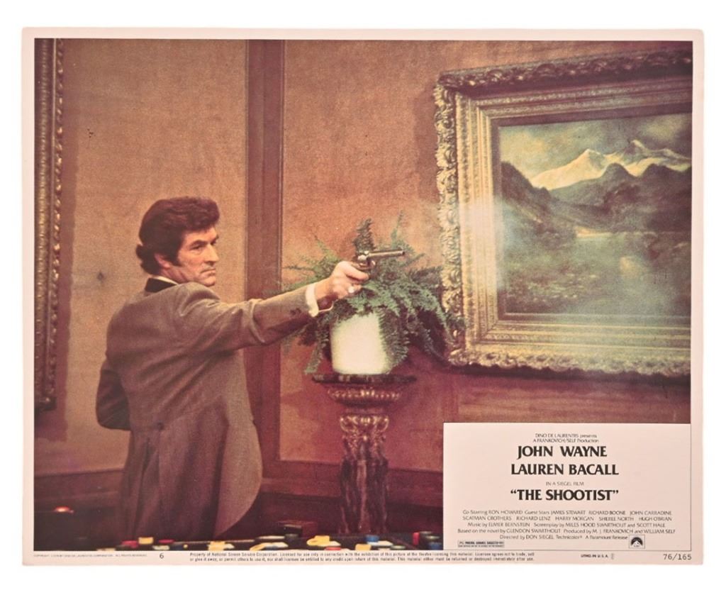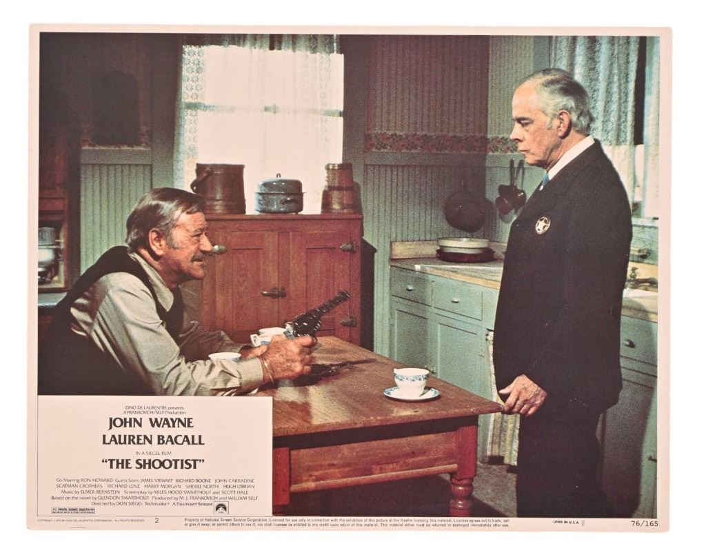 Entire pack of NOS promotional lobby cards for John Wayne's final film "The Shootist". Eight 11x14 lobby cards of the film starring John Wayne, Lauen Bacall, and Ron Howard, numbered 1-8 limited edition 76/165.