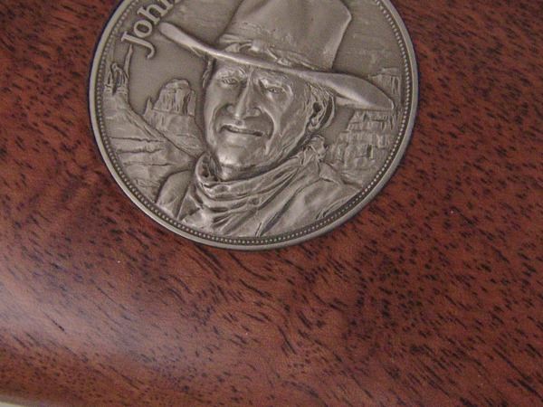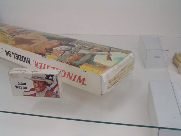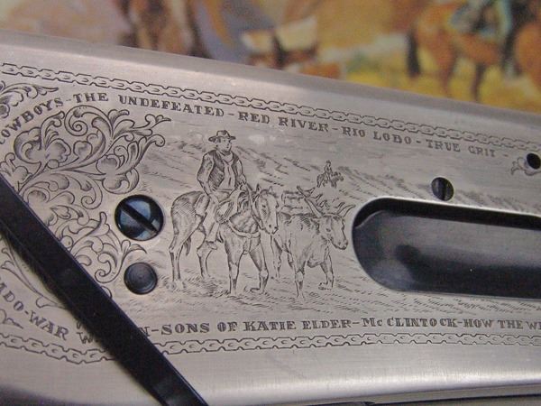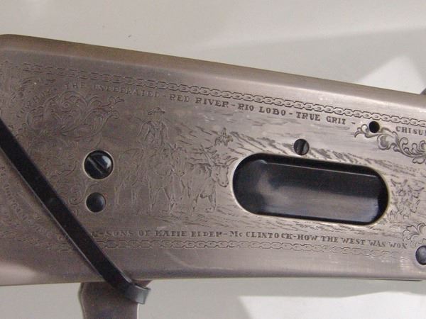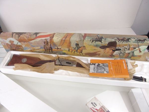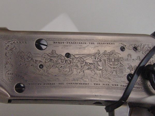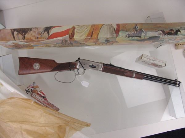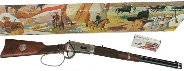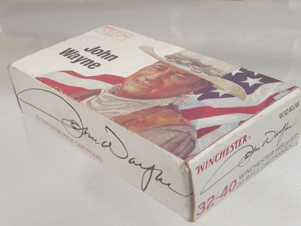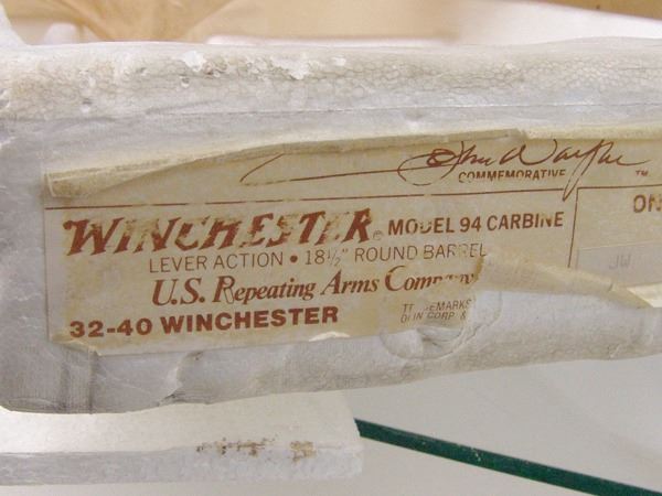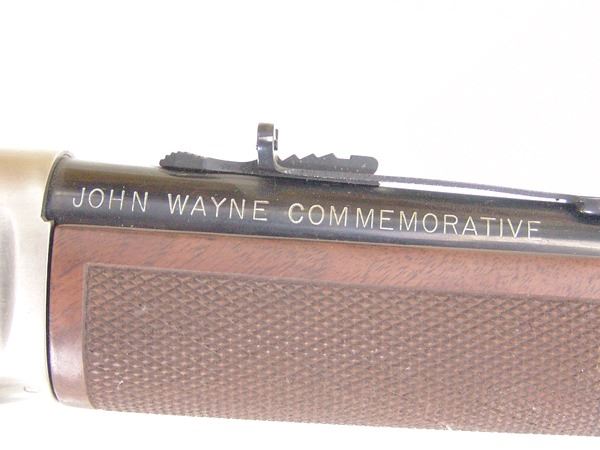 Limited edition, .32-40 cal. Model 94, large ring lever action "John Wayne Commemorative" saddle ring carbin, expertly engraved showing "The Duke" on horseback on one side of the receiver, and a stagecoach scene on the other, both encircled by a list of his most popular Western movies. Lot includes the original box, plus a box of "John Wayne" 32-40 ammo. Excellent condition. "One of only 500 made, and of only 90 sold." S/N JW-12576