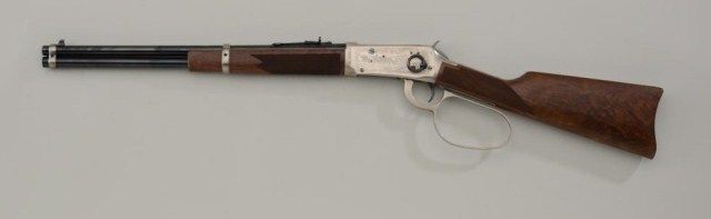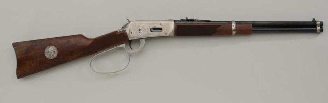 John Wayne Winchester Comm in box with slip cover and papers # JW15481. Excellent to new. Slip cover torn and taped. Leather John Wayne scabbard with original shipping box from U.S. Repeating Arms. Est. $900-$1,800.
