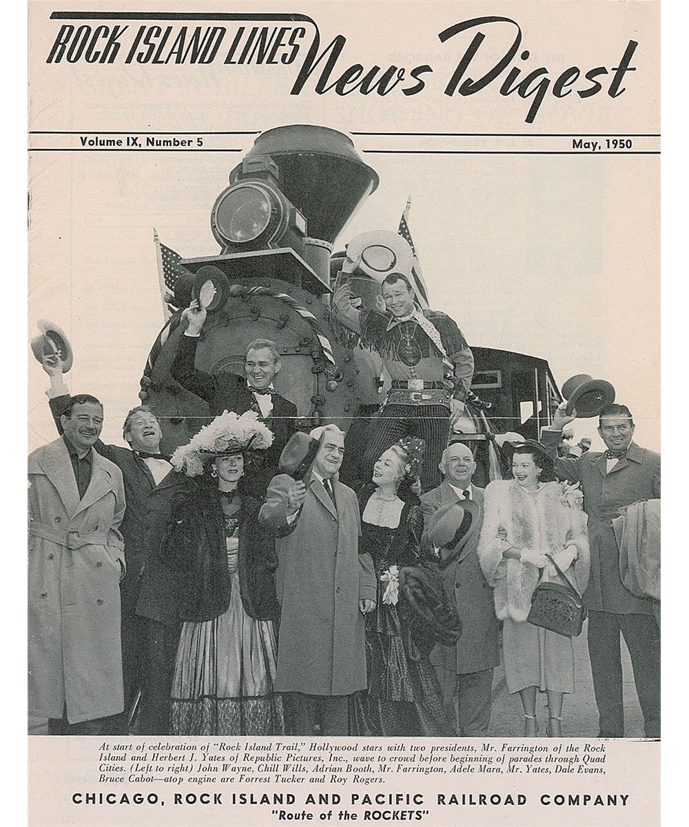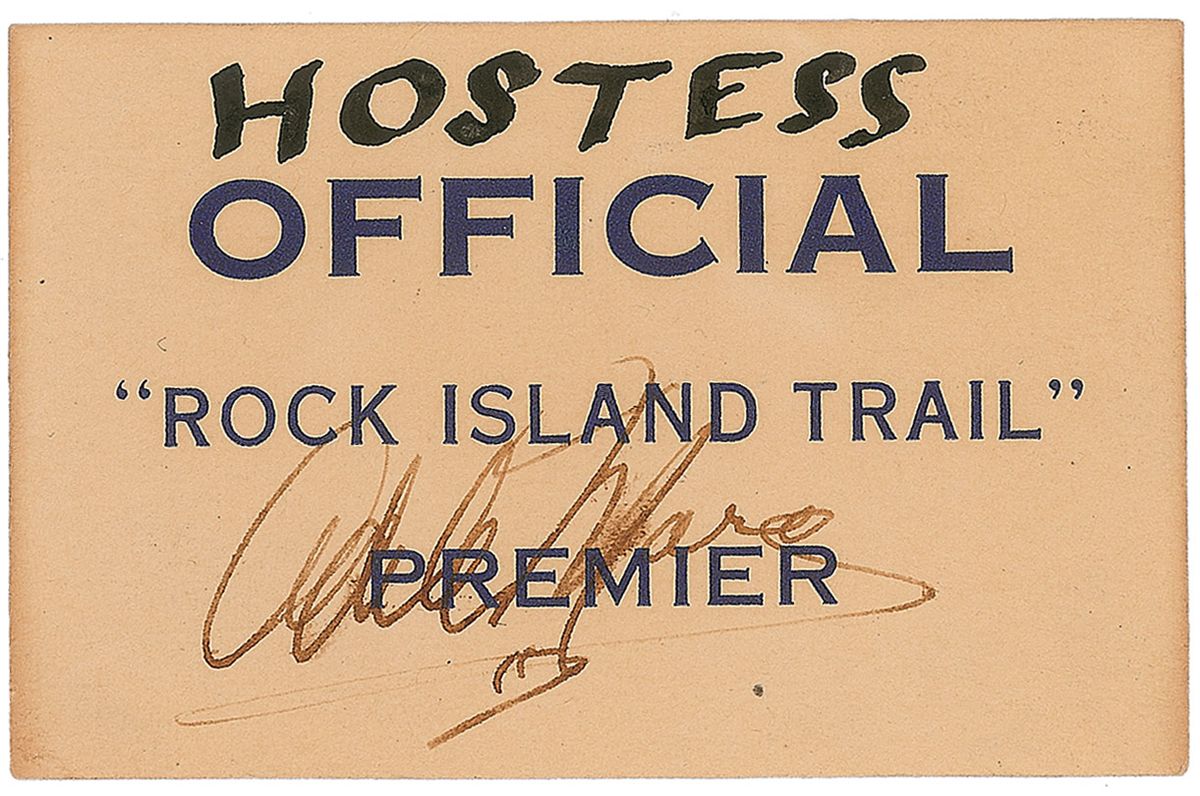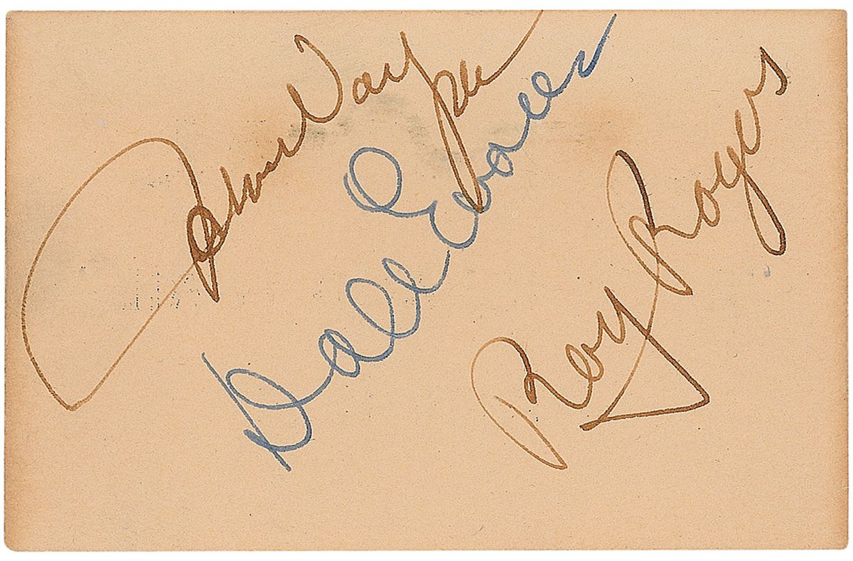 Official card from the premier of the 1950 film Rock Island Trail, 3 x 2, with “Hostess” written at the top of the front of the card. Signed on the reverse in brown and blue ink by John Wayne, Roy Rogers, and Dale Evans, and also signed on the front in brown ink by Adele Mara. The world premier of the film was held in the Quad Cities on April 27, 1950, and the stars took part in a pre-show promotional parade which started in Silvis, Illinois (the home of Rock Island Lines) and ending at the theater in Rock Island, Illinois. Accompanied by an engraved plaque and a copy of the Rock Island Lines News Digest, covering the parade and premier. In fine condition, with a bit of scattered light toning.
