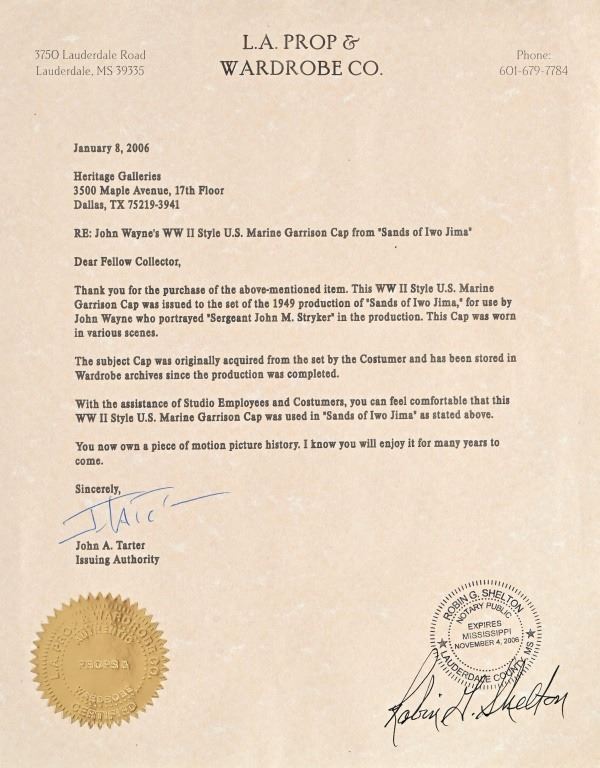John Wayne's screen worn movie prop Marine garrison cap worn by John Wayne while filming the "Sands of Iwo Jima". Includes COA from L.A. Prop & Wardrobe Co.