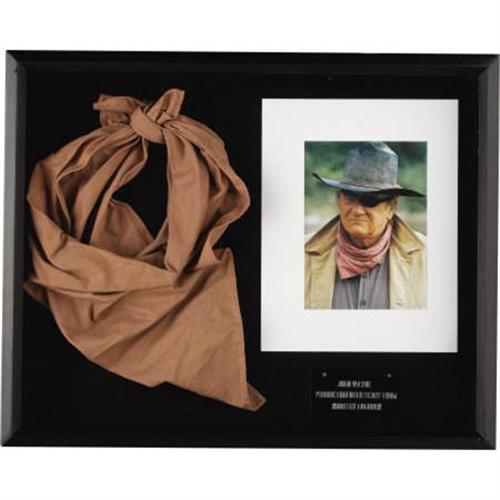 <B>John Wayne's Scarf from "Rooster Cogburn".</B></I> Wayne's performance in <I>True Grit</B></I> (1969) was successful enough to spawn the sequel <I>Rooster Cogburn</B></I> in 1973, and a third movie was being considered when, sadly, the sequel performed poorly at the box office. Nevertheless, Wayne's performance as the taciturn U.S. Marshall remains one of his most memorable roles. This mauve scarf was worn by him in the 1973 movie, and it has a Batjac Prod. Inc. stamp near the top (not readily visible). It has been framed along with a color 5" x 7" still of Wayne from the movie in a 21" x 17" x 2.5" display box, and is in Excellent condition. <I> Accompanied by COA from L.A. Prop and Wardrobe Co.</B></I><BR><BR><b>Shipping:</b> Framed - with Glass, Small (<a target="_blank" href="http://www.heritageauctions.com/common/shipping.php">view shipping information</a>)