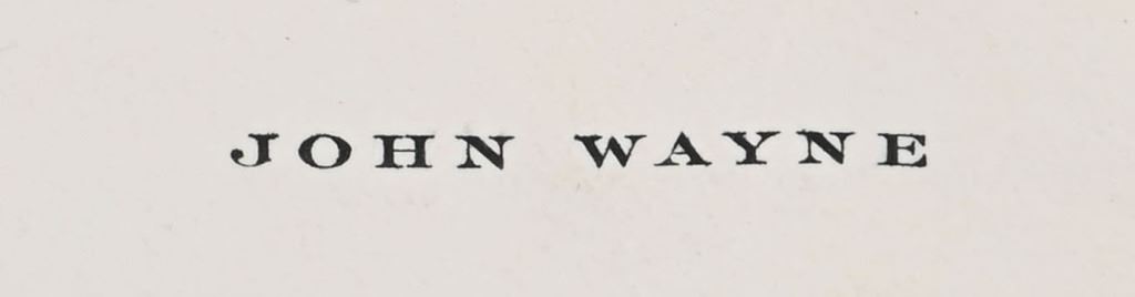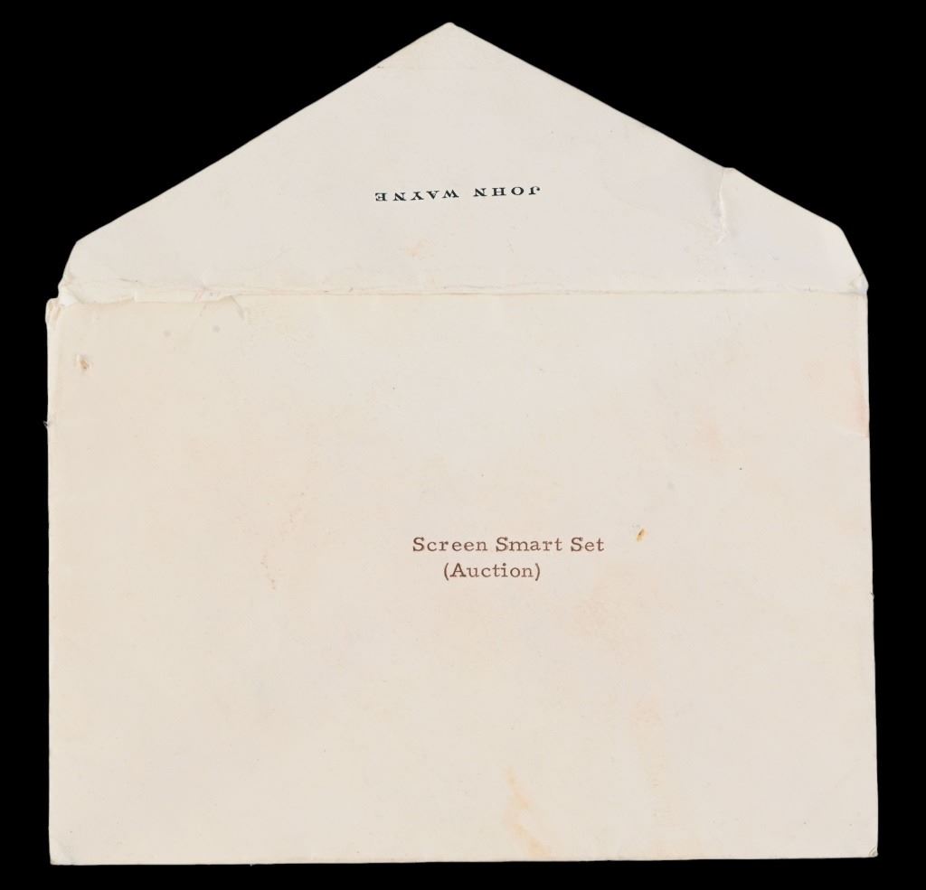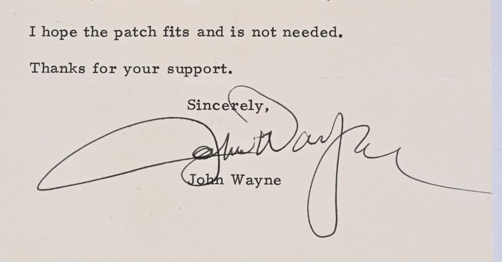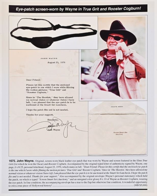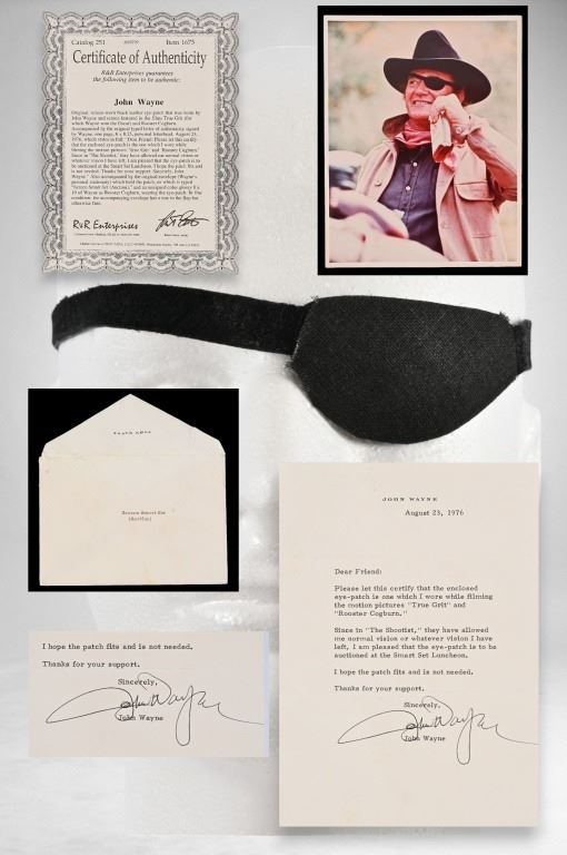 Worn by John Wayne in the films "True Grit" and "Rooster Cogburn". Provenance letter signed from John Wayne dated August 23, 1976, on his personal stationary, that the eye patch is the one he wore during the filming of True Grit & Rooster Cogburn, and that it would be included in the Smart Set Auction.