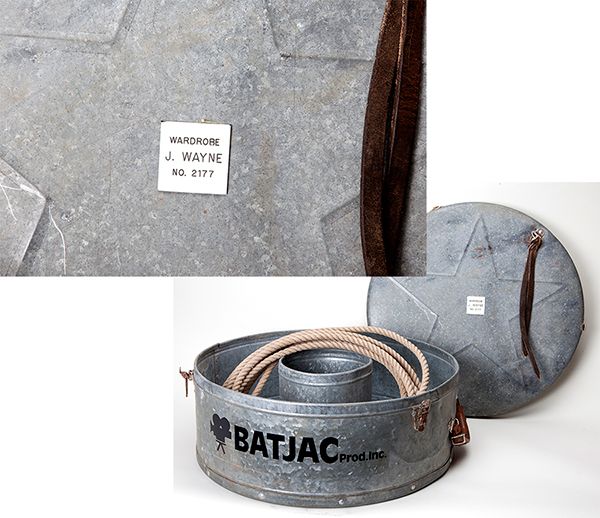 John Wayne's Used Lariat Case. Tin lariat case, 18 inches in diameter, with BATJAC Prod., Inc. on the side and a metal label on top, "Wardrobe J. Wayne No. 2177." Inside is a coiled lariat which was used by Wayne in various productions. The lariat and case were given to Andrew Yochem by John "Bear" Hudkins, who got it from John Wayne. Yochem owned a ranch that supplied horses to Hudkins Brothers Stables in Glendale, which supplied most of the horses, saddles, tack, wagons, stages, and other props used by Wayne's company, Batjac Productions, Inc., as well as numerous other studios and production companies. Wayne and other actors used to visit the Yochem ranch and go hunting with Andrew. "Bear" Hudkins worked with John Wayne on numerous productions and received a number of used and personal items from Wayne over the years. This lariat was one of the items which Hudkins obtained from Wayne and which was subsequently acquired by Yochem. A letter written by JO Yochem, Andrew Yochem's son, written June 17, 2007, includes all of the above information.