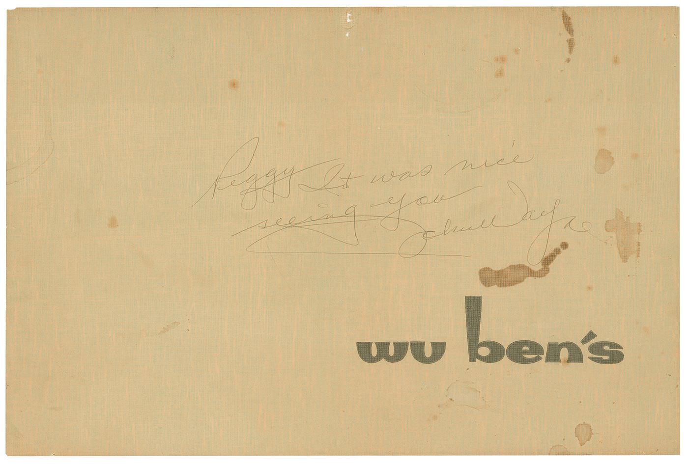 Off-white placemat from wv ben’s, 15.25 x 10, signed and inscribed in ballpoint, “Peggy, It was nice seeing you, John Wayne.” A central vertical fold, scattered staining and soiling, and a few small edge tears, otherwise fine condition.
