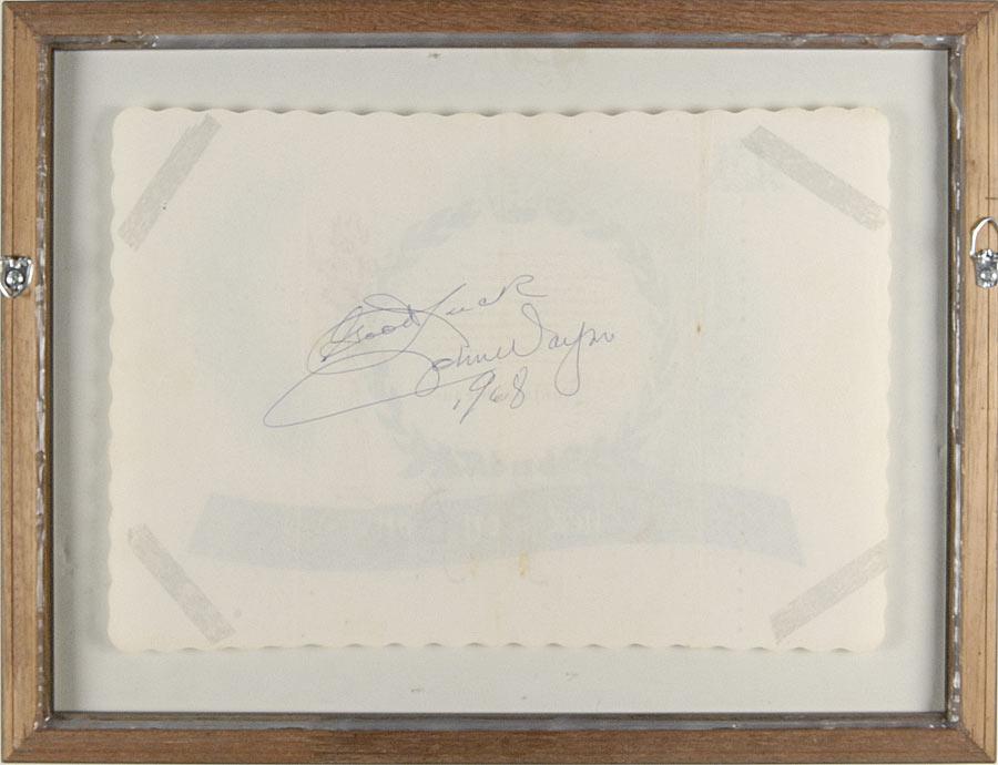 Large ballpoint signature, “Good luck, John Wayne 1968,” on the reverse of a 13.5 x 9.5 place mat from Chez Bon Bon in the Fontainebleu Hotel. Framed to an overall size of 17.25 x 13.25. Intersecting folds, a couple passing through signature and sentiment, some scattered light toning, and tape remnants to each corner, otherwise fine condition.