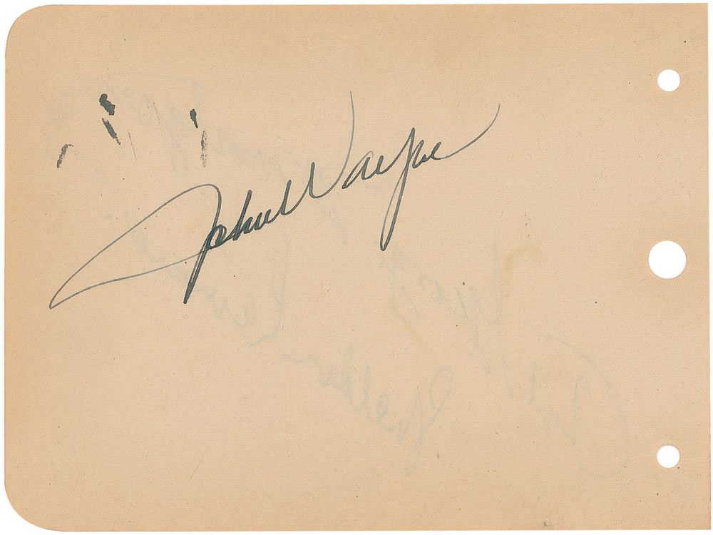 Early vintage fountain pen signature, “John Wayne,” on an off-white 5.75 x 4.25 album page. Some light show-through from two signatures on reverse, a few wrinkles, and a few stray ink marks above signature, otherwise fine condition. Consignor notes that the signature dates from 1942-1943.