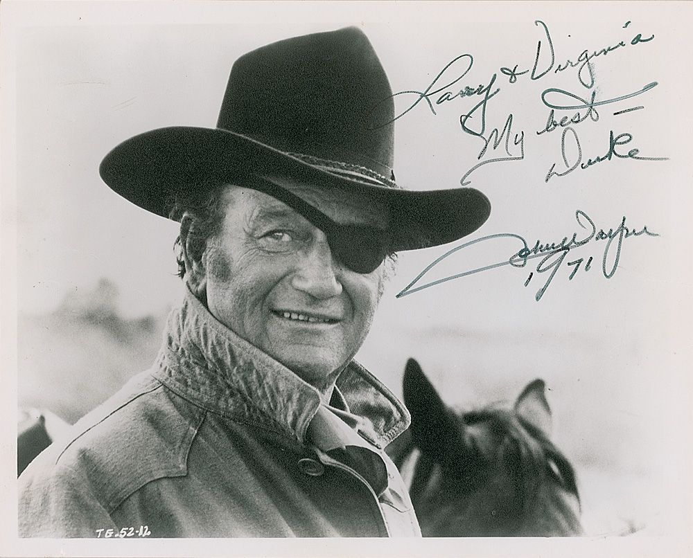 Matte-finish 10 x 8 photo of Wayne as Rooster Cogburn from True Grit, signed and inscribed in black felt tip “Larry & Virginia, My best, Duke, John Wayne 1971.” In fine condition, with a few light bends and creases and a trivial brush to inscription.