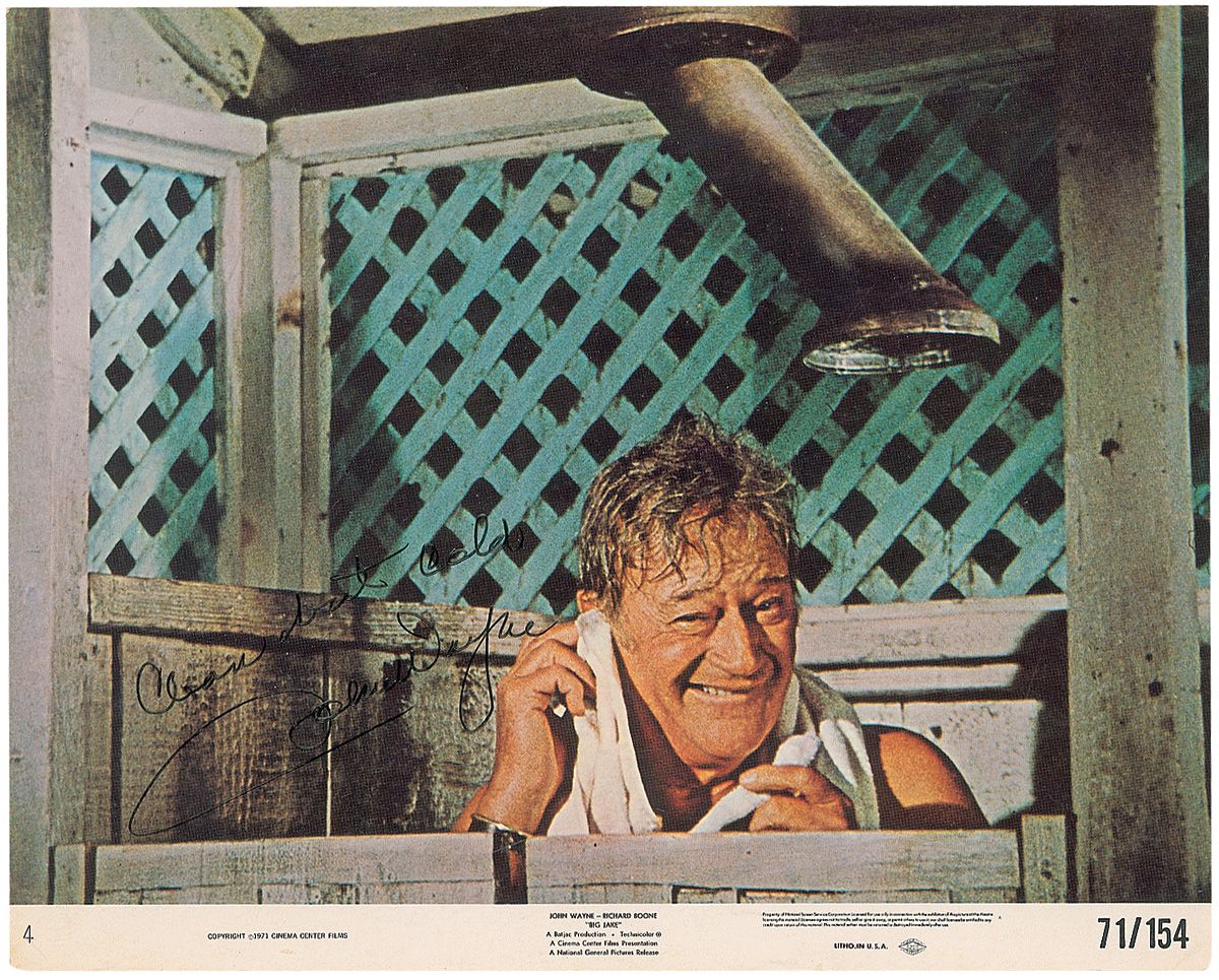 Color 10 x 8 cardstock press kit photo of Wayne in Big Jake, signed in black ink “Clean but cold, John Wayne.” In fine condition, with some light contrast to signature.