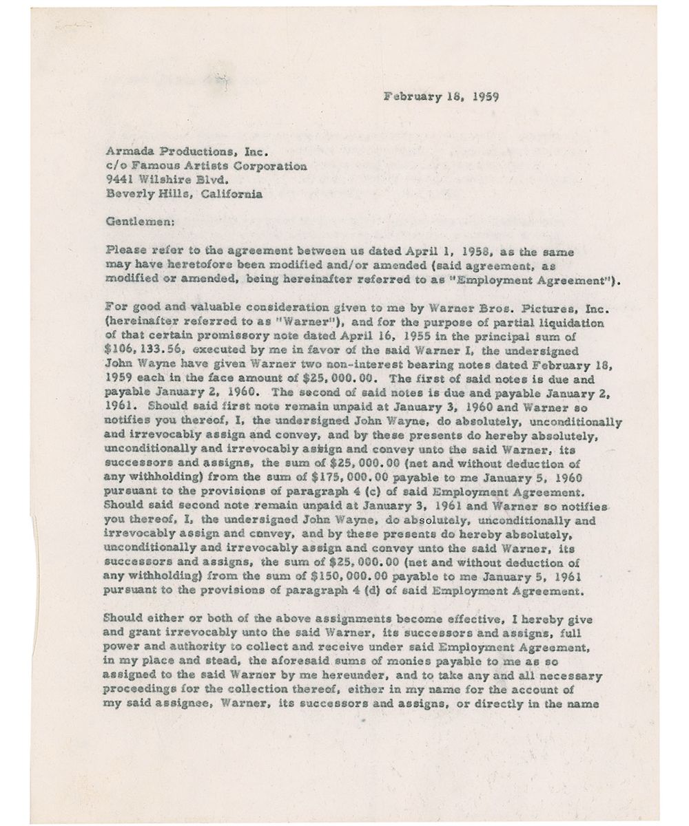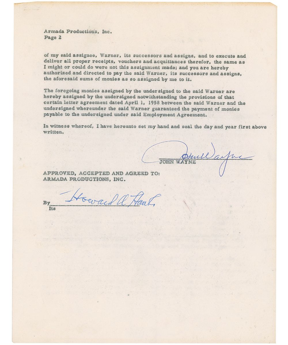 DS, two onionskin pages, 8.5 x 11, February 18, 1959. Agreement between Wayne and Warner Bros. for “the purpose of partial liquidation of that certain promissory note dated April 16, 1955 in the principal sum of $106,133.56 executed by me…I, the undersigned John Wayne have given Warner two non-interest bearing notes…each in the face amount of $25,000.00…I, the undersigned John Wayne, do absolutely…assign and convey unto the said Warner…the sum of $25,000.00…from the sum of $175,000.00.” Signed on the second page in blue ballpoint by Wayne and also signed by noted director Howard Hawks. In fine condition, with some light wrinkling and creasing, staple holes to top left, and mild toning along top edge. Wayne and Hawks had recently finished working together on Rio Bravo, which would premier the following month, and Wayne would soon begin filming his directorial debut, The Alamo, which he partly financed himself. Wayne assumed huge personal debt to get the film finished after United Artists refused to pay for cost overruns.