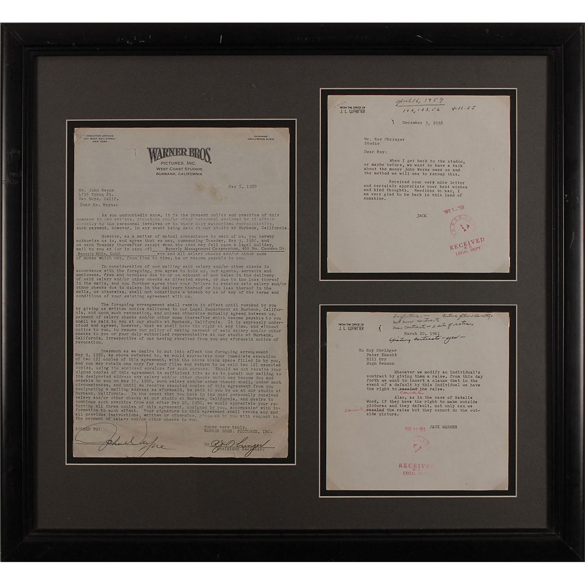 Also included are two unsigned typed letters from Jack Warner, both having notations and a couple of corrections in an unknown hand, the first one dated December 3, 1958, reads, in part: “When I get back to the studio, or maybe before, we want to have a talk about the money John Wayne owes us and the method we will use to recoup this.” The second letter, sent to Orbinger and three others, dated March 20, 1961, reads, in full: “Whenever we modify an individual’s contract by giving them a raise, from this day forth we want to insert a clause that in the event of a default by this individual we have the right to cancel the raise. Also, as in the case of Natalie Wood, if they have the right to make outside pictures and they default, not only can we cancel the raise but they cannot do the outside picture.” All three are matted and framed to an overall size of 23 x 21.5. In very good condition, with scattered creasing to document, some lightly passing through Wayne’s signature, a bit of scattered light soiling, and a small staple hole near top. Both letters have a small staple hole and office stamps.