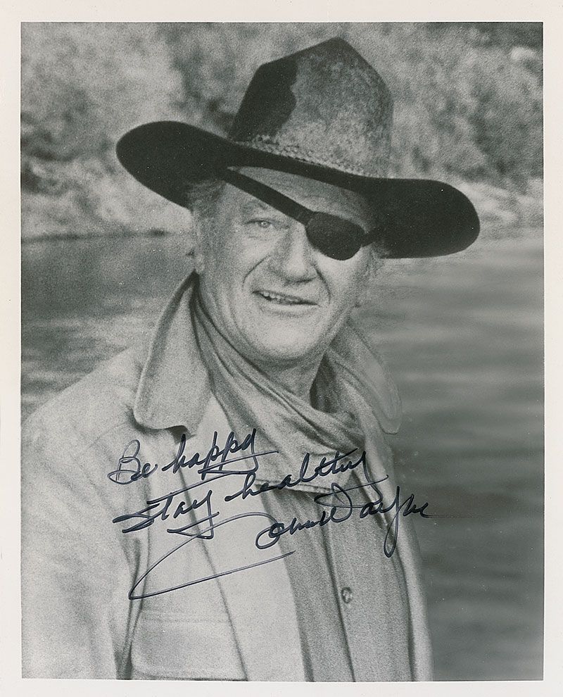 Great matte-finish 8 x 10 photo of Wayne in his Academy Award-winning role as Rooster Cogburn, signed in black felt tip, “Be happy, stay healthy, John Wayne.” In fine condition, with some mild rippling along top edge.