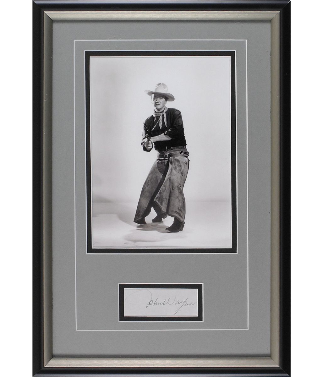 Vintage fountain pen signature, “John Wayne,” on an off-white 3.25 x 1.25 slip. Appealingly triple-matted and framed with a photo of Wayne drawing a gun to an overall size of 12 x 17.5. In fine condition.