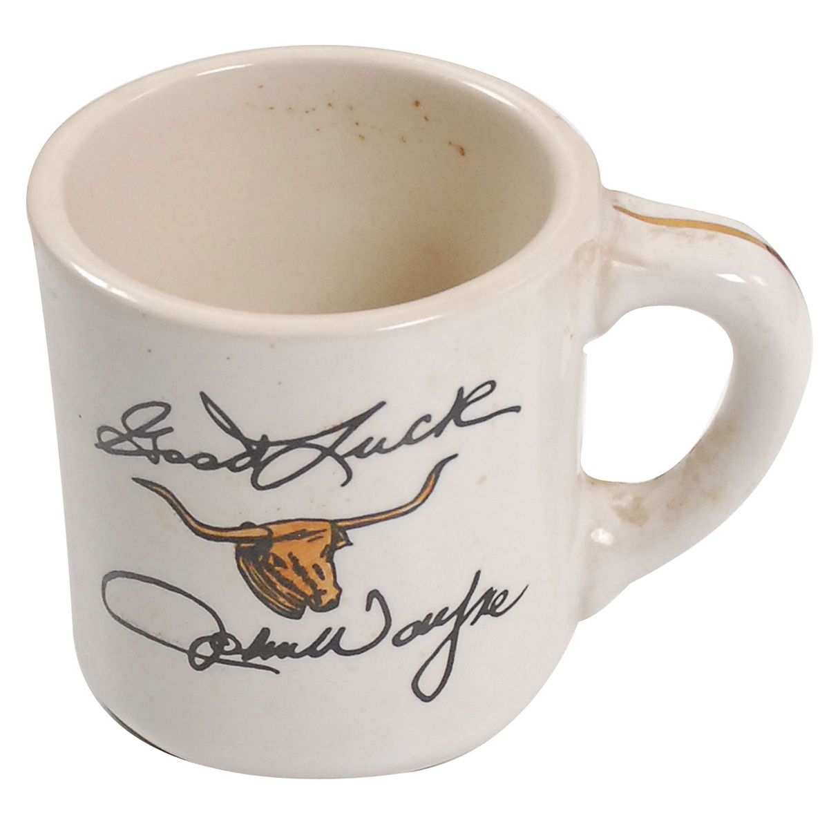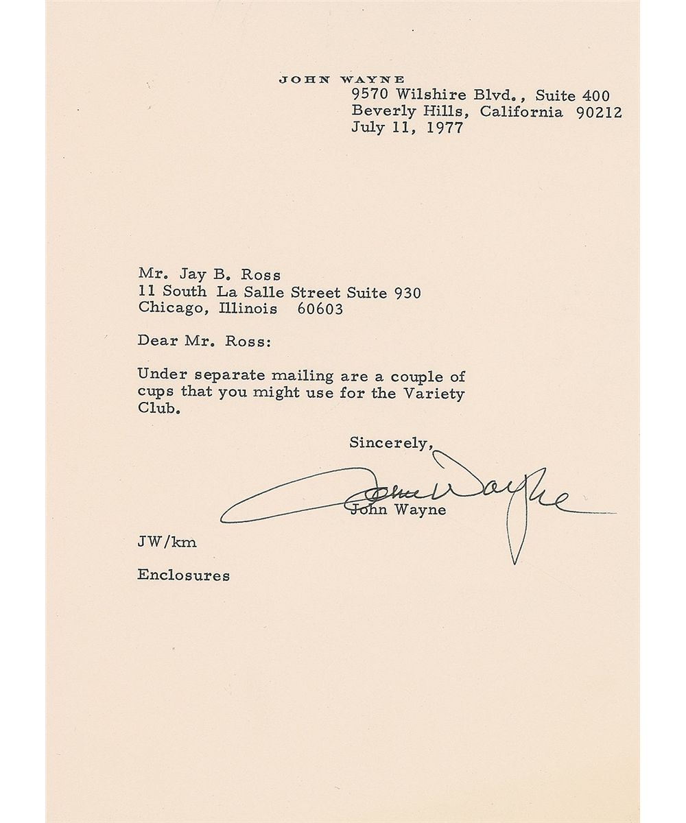 TLS, one page, 6 x 8.25, personal letterhead, July 11, 1977. Short letter sending mugs. In full: “Under separate cover are a couple of cups that you might use for the Variety Club.” In fine condition. Accompanied by one of the mugs, featuring a color image of Wayne as Rooster Cogburn as well as a printed signature, by Ketchum Originals of Long Beach, and showing evidence of use.