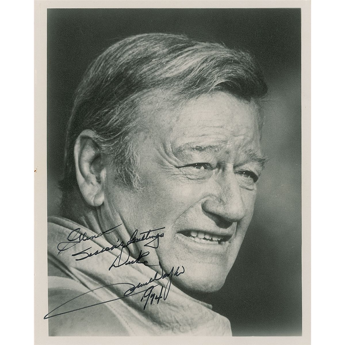 Rugged matte-finish 8 x 10 head-and-shoulders photo, signed and inscribed in black felt tip, “Glenn—Season’s Greetings, Duke, John Wayne 1974.” In fine condition.