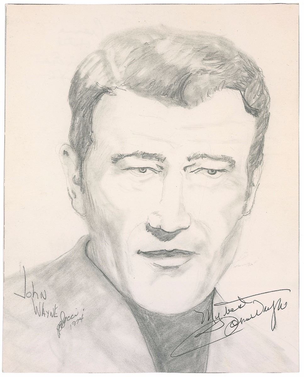 Handsome original sketch of Wayne accomplished by an admirer in pencil on an off-white 7.75 x 9.75 cardstock sheet, signed in the lower right in black ink, “My best, John Wayne.” Dated 1974 by the artist in the lower left. In fine condition, with a slight brush to one letter of the signature. Collector’s notation on reverse indicates that the signature was obtained at the Pierre Hotel in New York City.